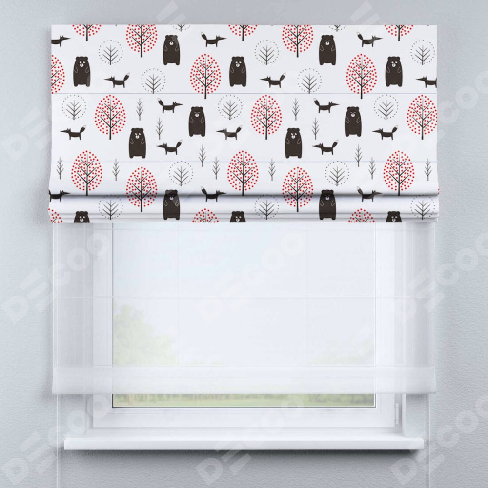 Римская штора день-ночь производителя «Cortin», используется для проёма, пошита из двух полотен, с лицевой блэкаут с нанесением сублимационной печати «Сканди лес», вторая ткань тюль (по стандарту комплектуется тюль белого цвета артикул V-01). Имеет универсальный механизм и подходит для монтажа: на потолок, на стену и в нишу.