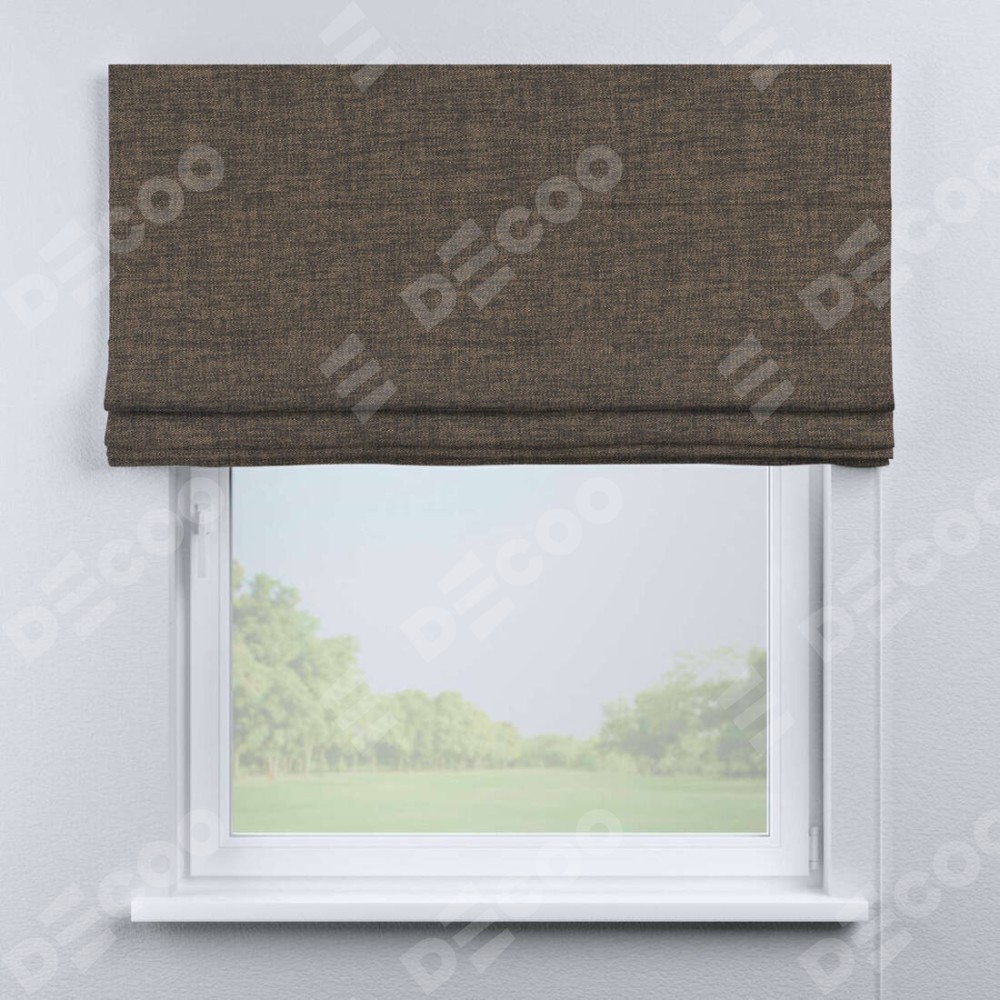 Римская штора производителя «Cortin», используется для проёма, пошита из ткани рогожка димаут коричневый, артикул ткани 80420. Имеет универсальный механизм и подходит для монтажа: на потолок, на стену и в нишу.