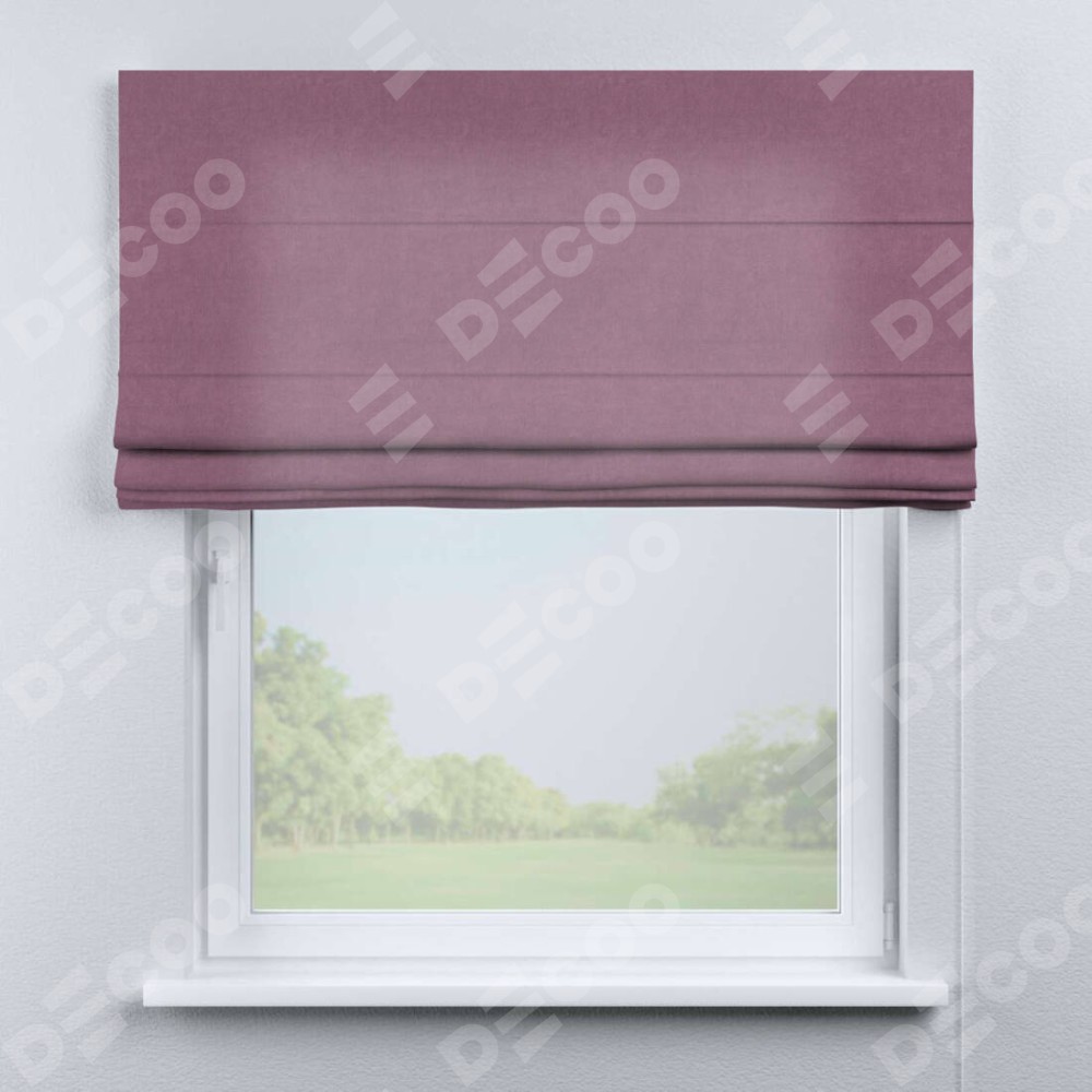 Римская штора производителя «Cortin», используется для проёма, пошита из ткани вельвет лиловый, артикул ткани 17752. Имеет универсальный механизм и подходит для монтажа: на потолок, на стену и в нишу.