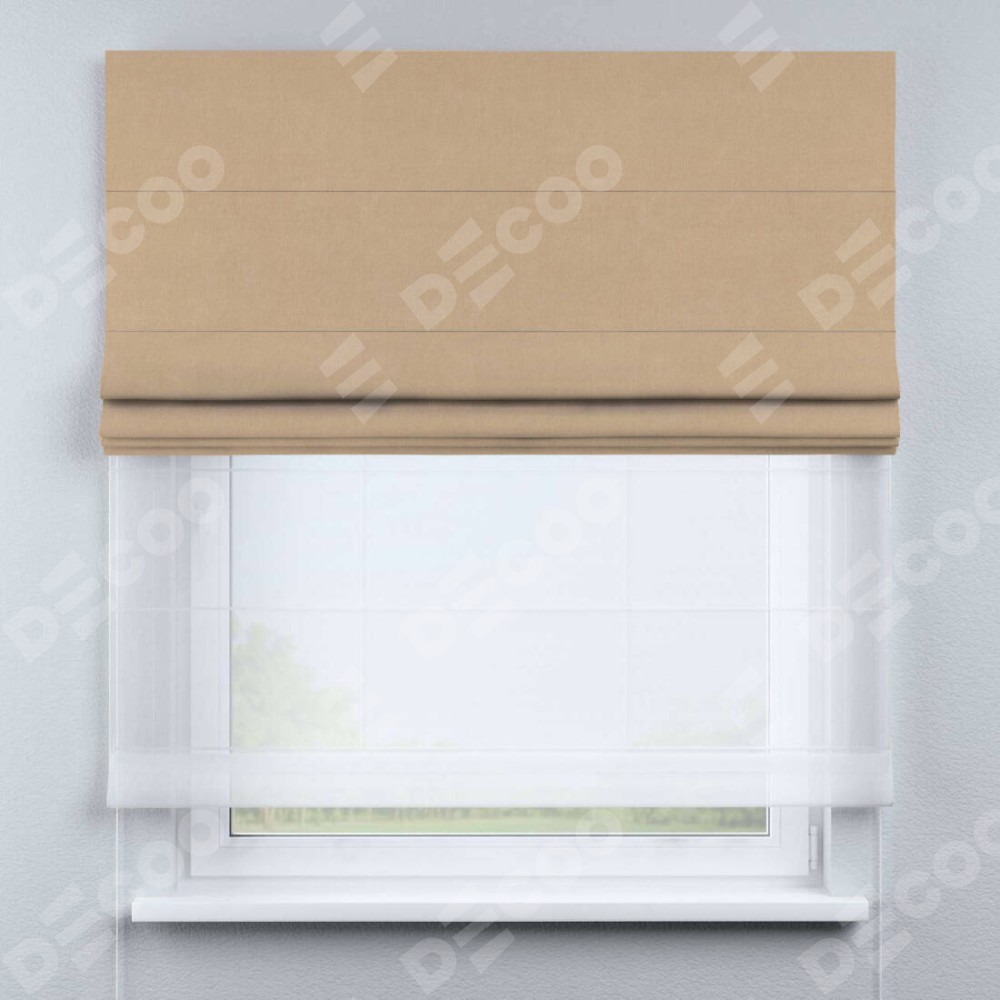 Римская штора день-ночь производителя «Cortin», используется для проёма, пошита из двух полотен, с лицевой стороны вельвет песочный артикул 17740, вторая ткань тюль (по стандарту комплектуется тюль белого цвета артикул V-01). Имеет универсальный механизм и подходит для монтажа: на потолок, на стену и в нишу.