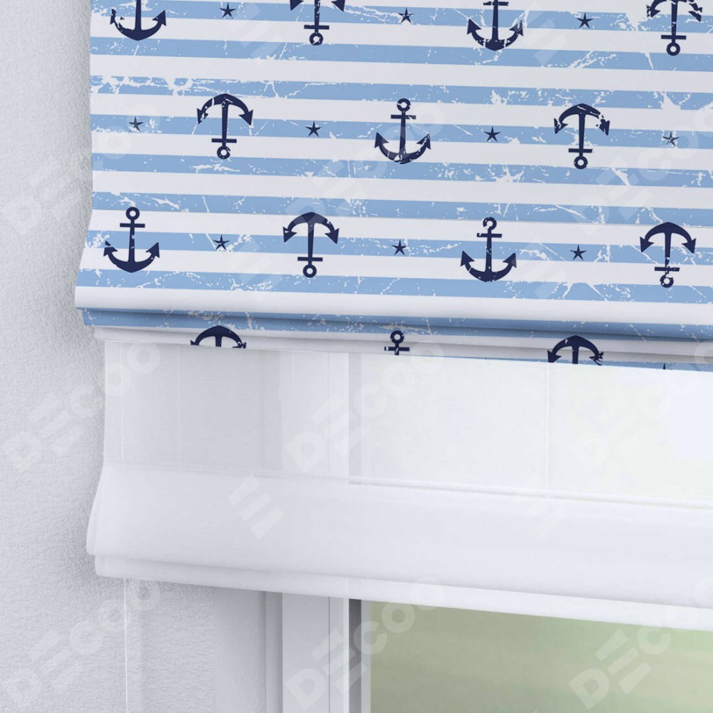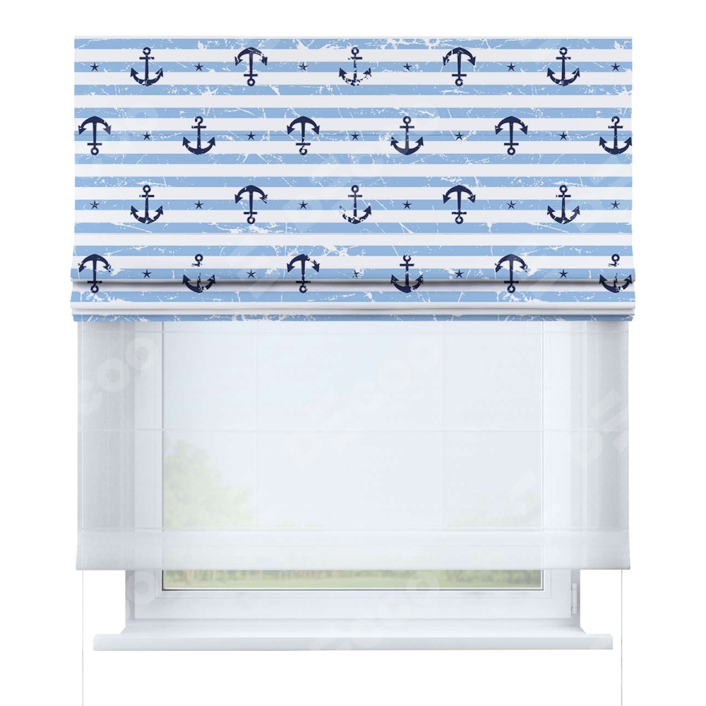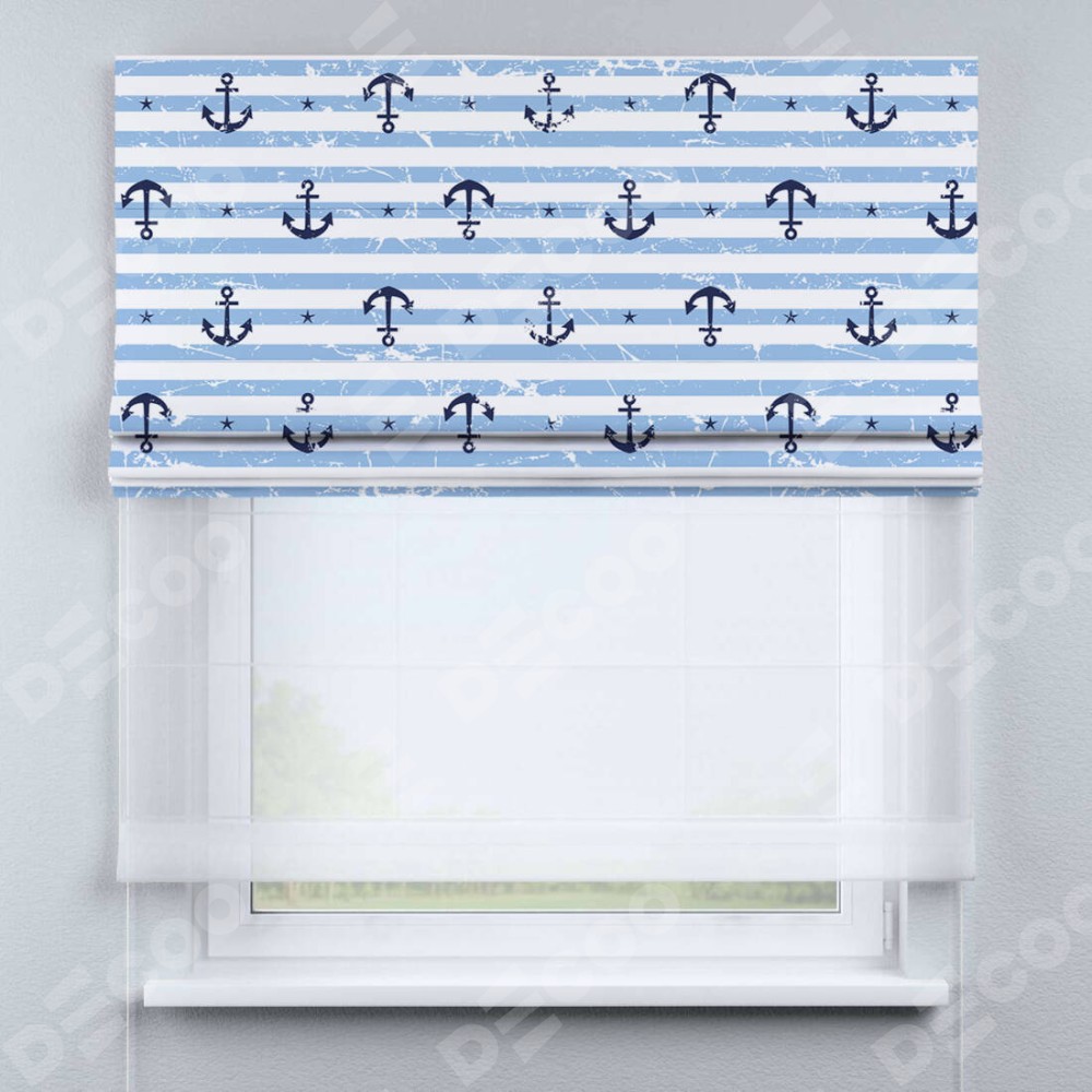 Римская штора день-ночь производителя «Cortin», используется для проёма, пошита из двух полотен, с лицевой блэкаут с нанесением сублимационной печати «Полоски и якори», вторая ткань тюль (по стандарту комплектуется тюль белого цвета артикул V-01). Имеет универсальный механизм и подходит для монтажа: на потолок, на стену и в нишу.
