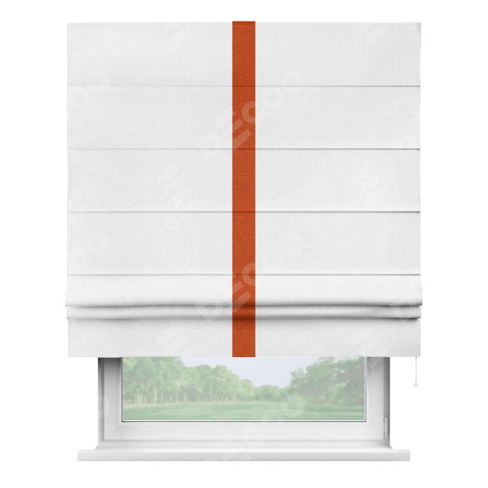 Римская штора производителя «Cortin», используется для проёма, пошита из ткани лён белый, артикул 53430. Отделка шторы кантом «Хайвэй», ткань для канта используется из льна разной расцветки на выбор. Имеет универсальный механизм и подходит для монтажа: на потолок, на стену и в нишу.
