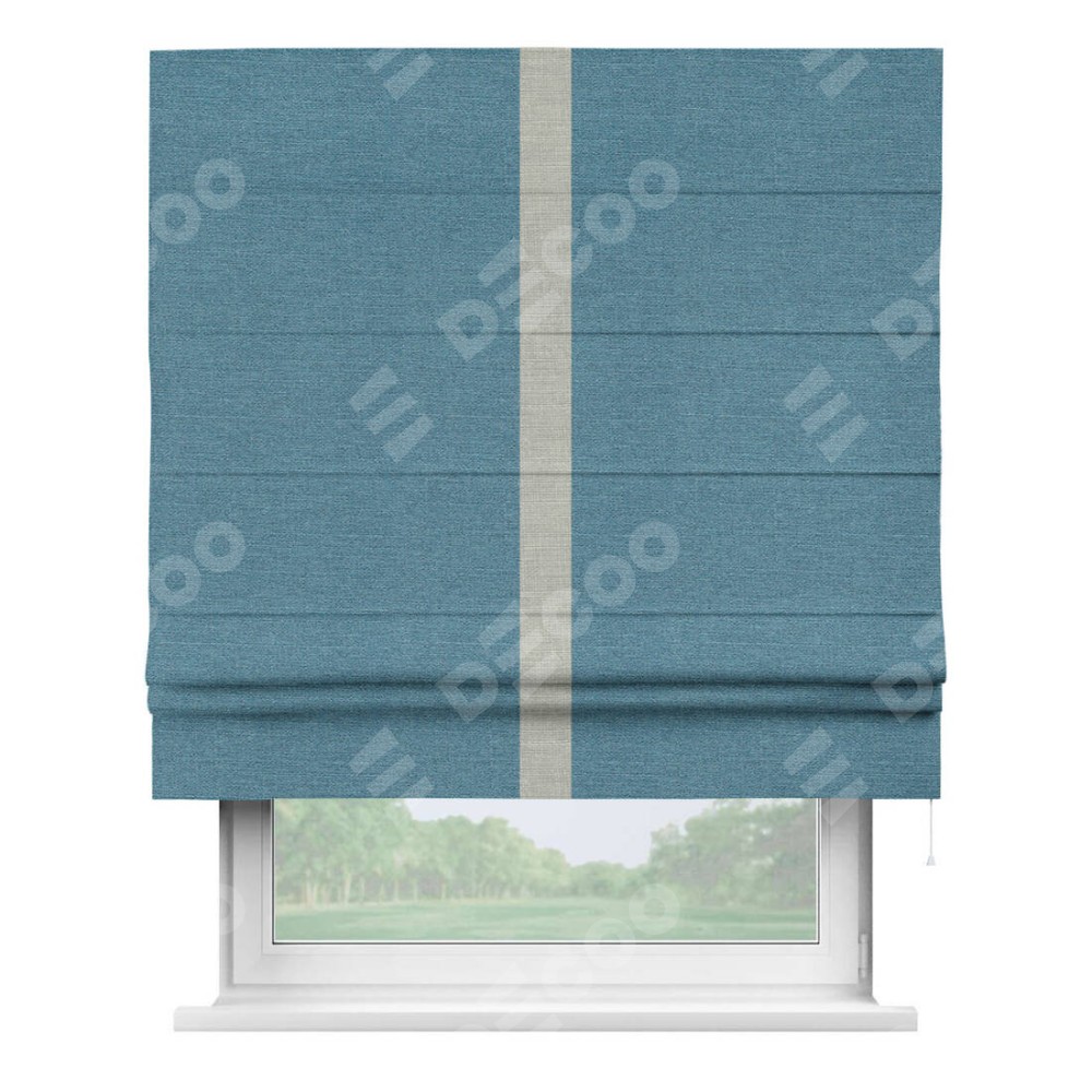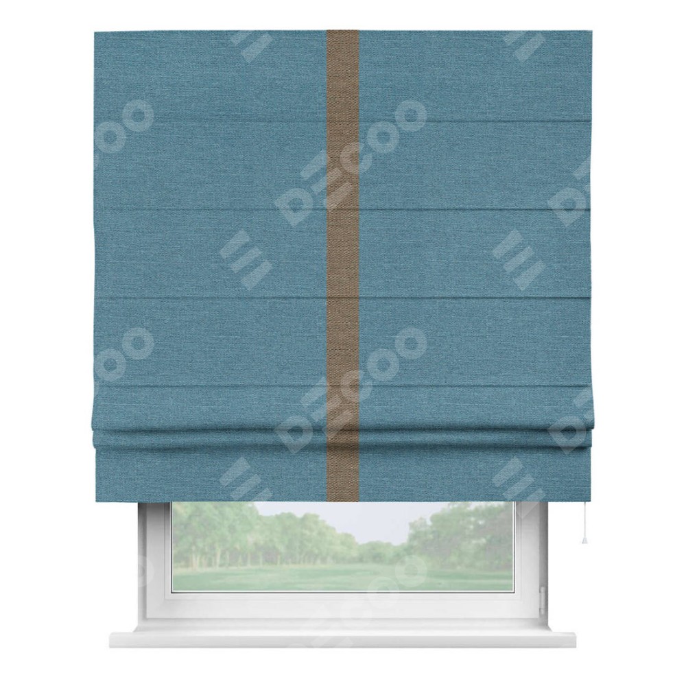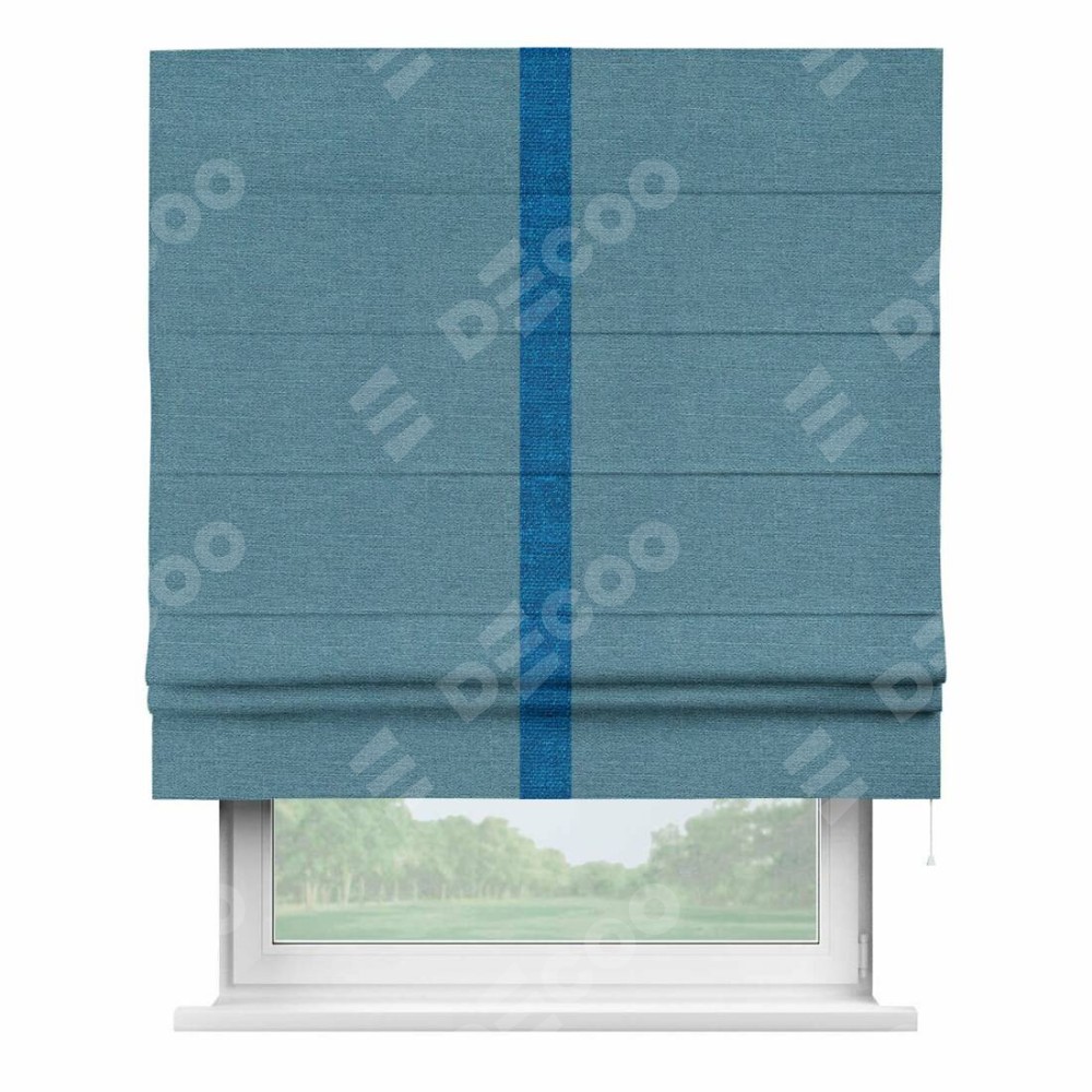 Римская штора производителя «Cortin», используется для проёма, пошита из ткани лён голубой, артикул 63741. Отделка шторы кантом «Хайвэй», ткань для канта используется из льна разной расцветки на выбор. Имеет универсальный механизм и подходит для монтажа: на потолок, на стену и в нишу.