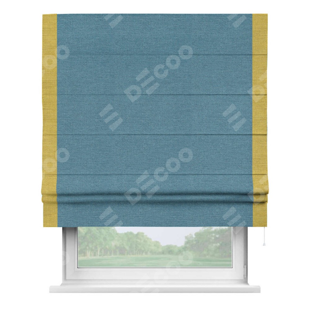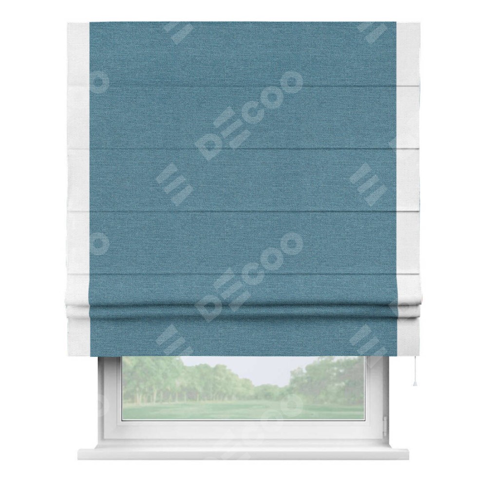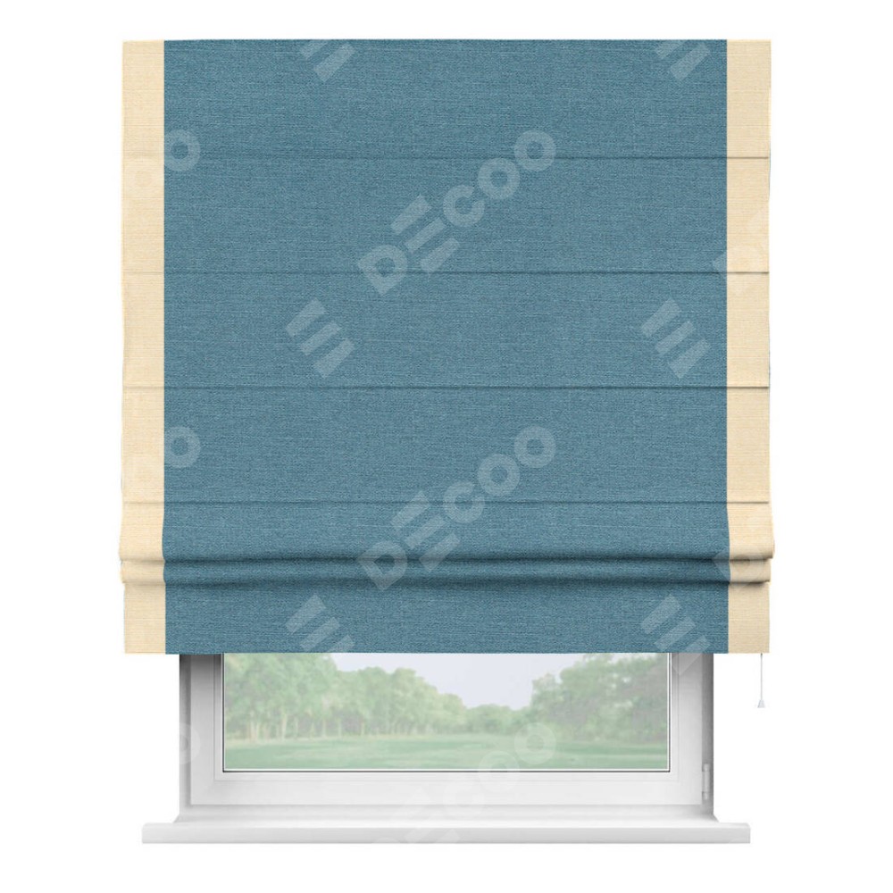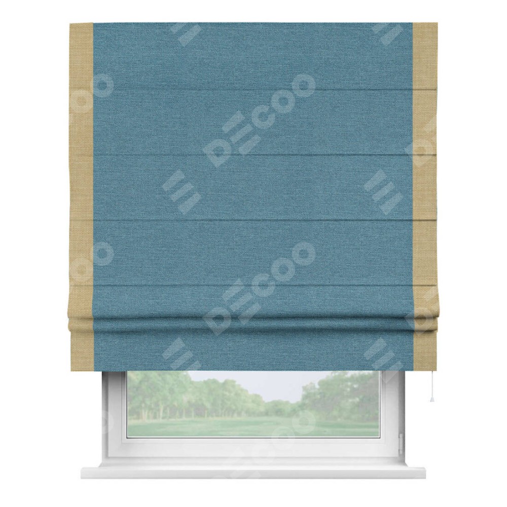 Римская штора производителя «Cortin», используется для проёма, пошита из ткани лён голубой, артикул 63741. Отделка шторы кантом «Стрим Дуо», ткань для канта используется из льна разной расцветки на выбор. Имеет универсальный механизм и подходит для монтажа: на потолок, на стену и в нишу.