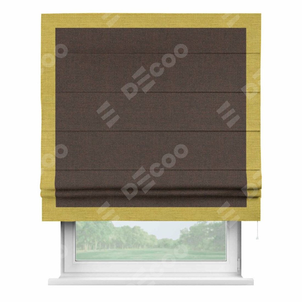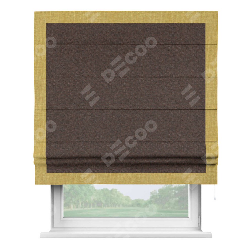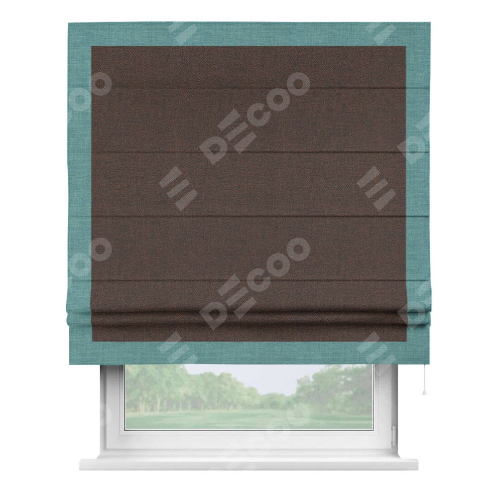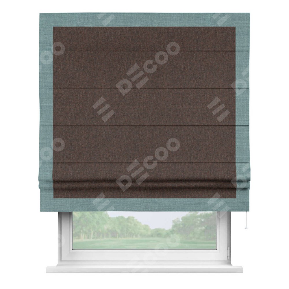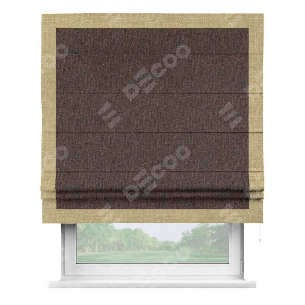 Римская штора производителя «Cortin», используется для проёма, пошита из ткани лён коричневый, артикул 53443. Отделка шторы кантом «Чесс», ткань для канта используется из льна разной расцветки на выбор. Имеет универсальный механизм и подходит для монтажа: на потолок, на стену и в нишу.