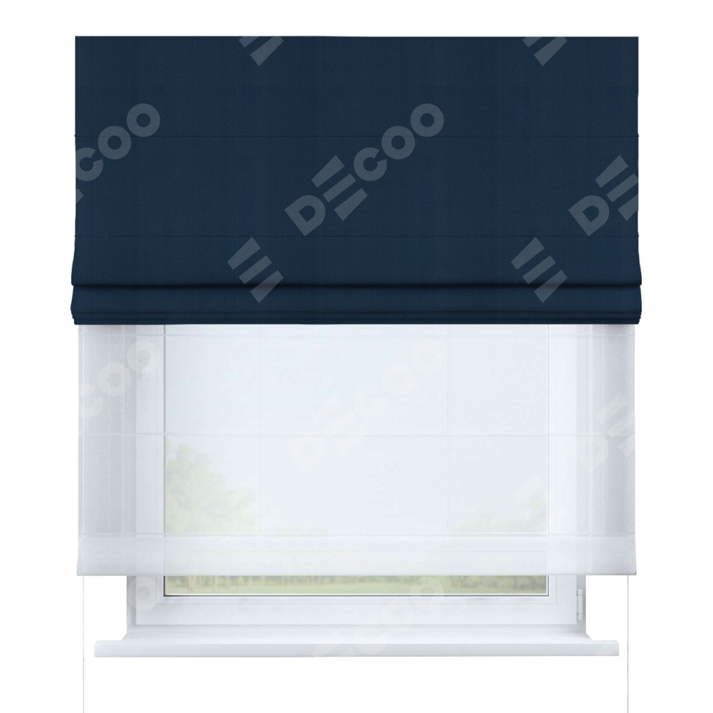 Римская штора день-ночь производителя «Cortin», используется для проёма, пошита из двух полотен, с лицевой стороны блэкаут однотонный синий артикул 29327, вторая ткань тюль (по стандарту комплектуется тюль белого цвета артикул V-01). Имеет универсальный механизм и подходит для монтажа: на потолок, на стену и в нишу.