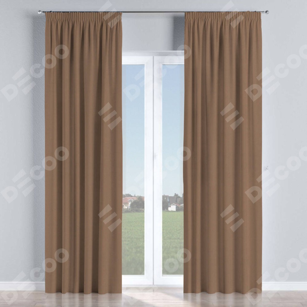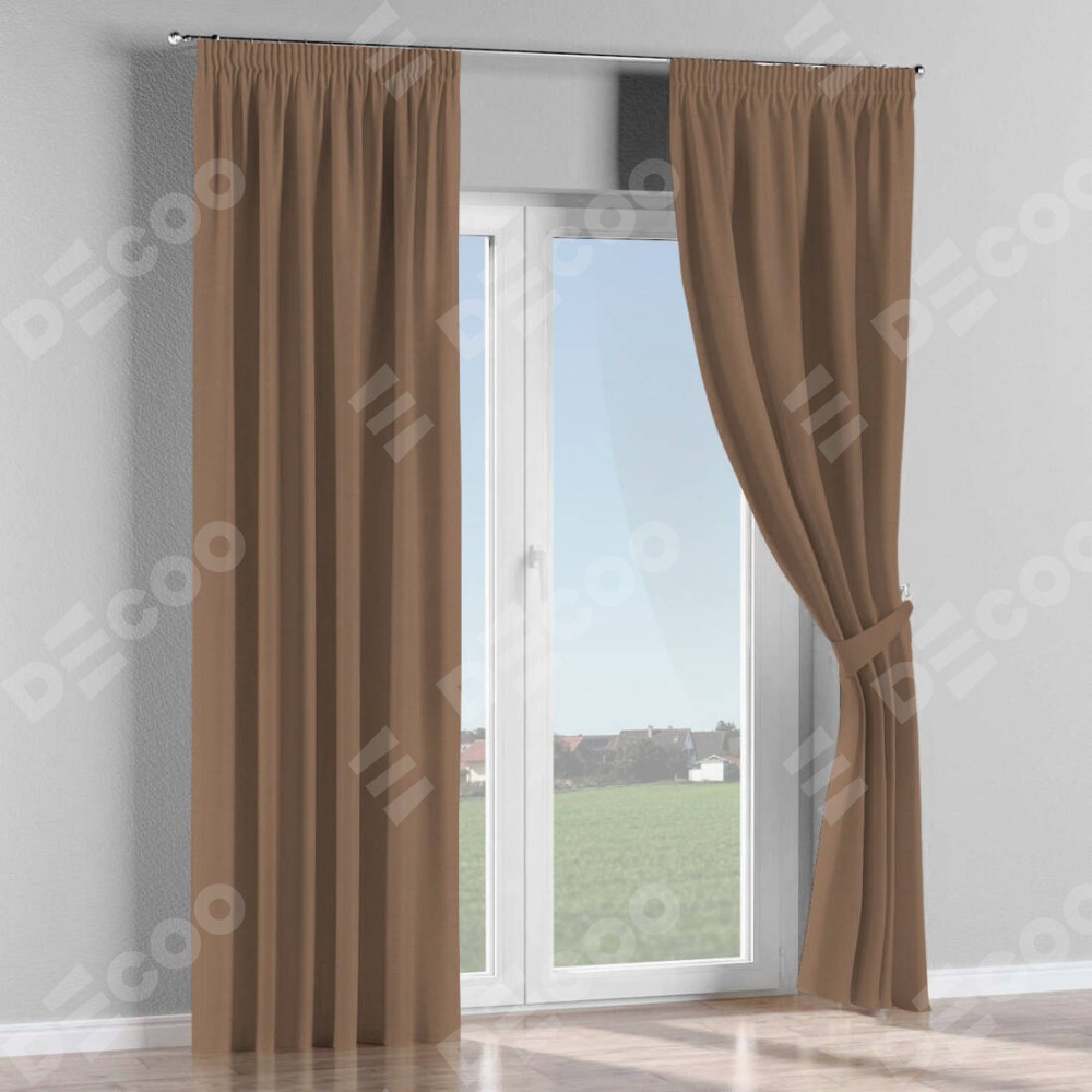 Комплект прямых штор, от производителя «Cortin», пошиты из ткани блэкаут однотонный коричневый, артикул ткани 88285. С изнаночной стороны в верхней части штор пристрачивается шторная лента с декоративными складками «Карандаш». Для создания элегантных складок прямые шторы шьются по стандарту с коэффициентом 1:2 (на 100 см. ширины проёма 200 см. ширины ткани).