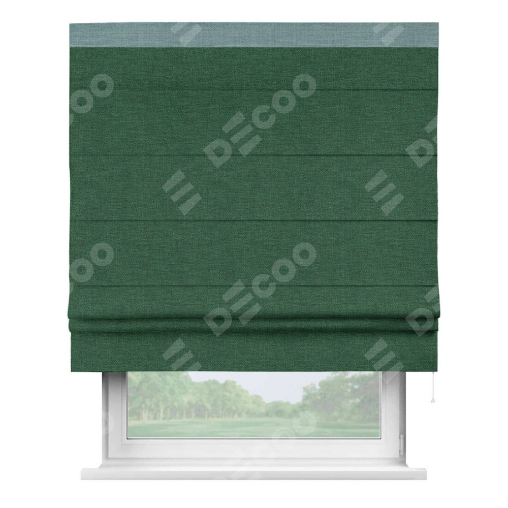 Римская штора производителя «Cortin», используется для проёма, пошита из ткани лён серо-зеленый, артикул 63740. Отделка шторы кантом «Кинг», ткань для канта используется из льна разной расцветки на выбор. Имеет универсальный механизм и подходит для монтажа: на потолок, на стену и в нишу.