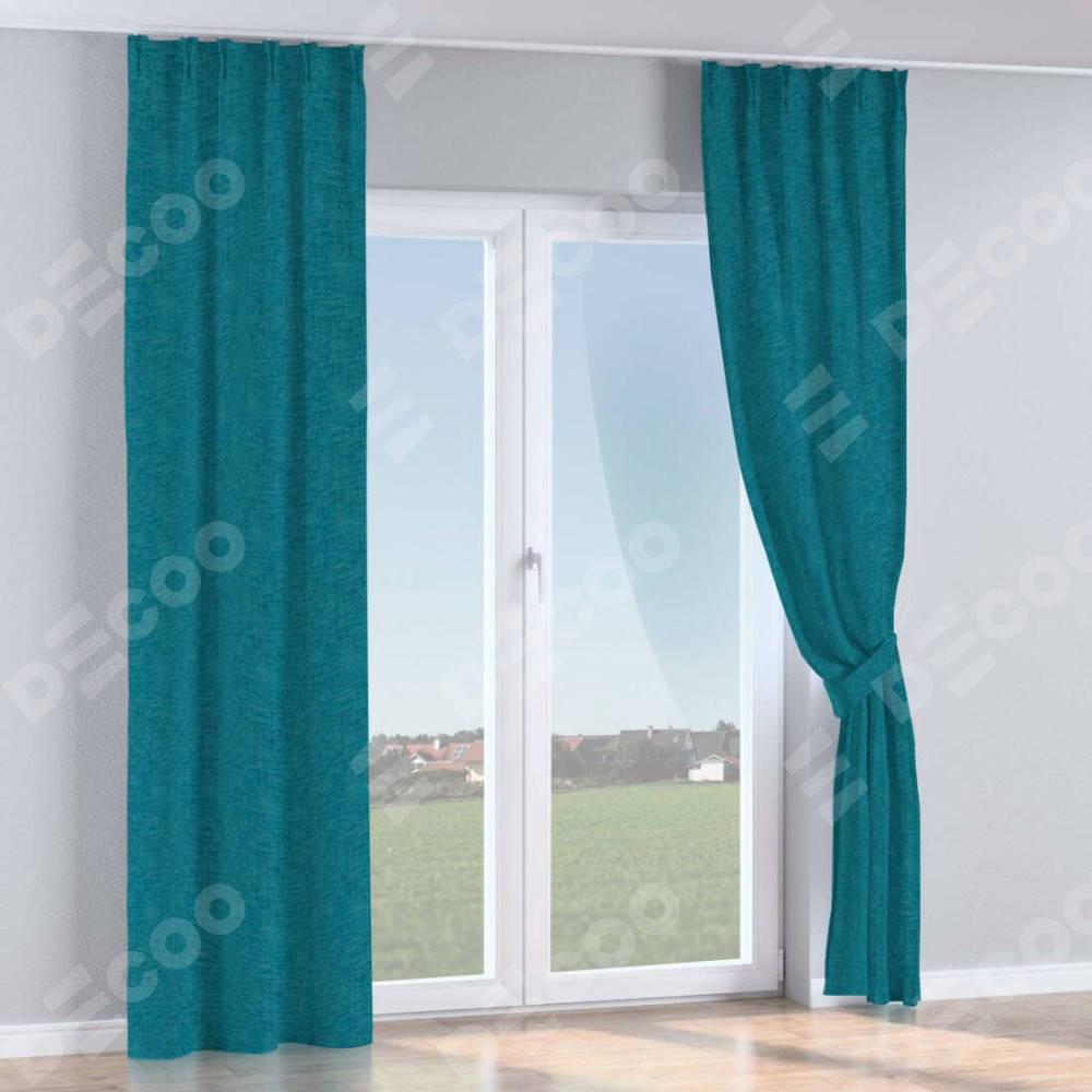 Комплект прямых штор, от производителя «Cortin», пошиты из ткани рогожка димаут синий, артикул ткани 80422. С изнаночной стороны в верхней части штор пристрачивается шторная лента с декоративными складками «Кустик». Для создания элегантных складок прямые шторы шьются по стандарту с коэффициентом 1:2 (на 100 см. ширины проёма 200 см. ширины ткани).
