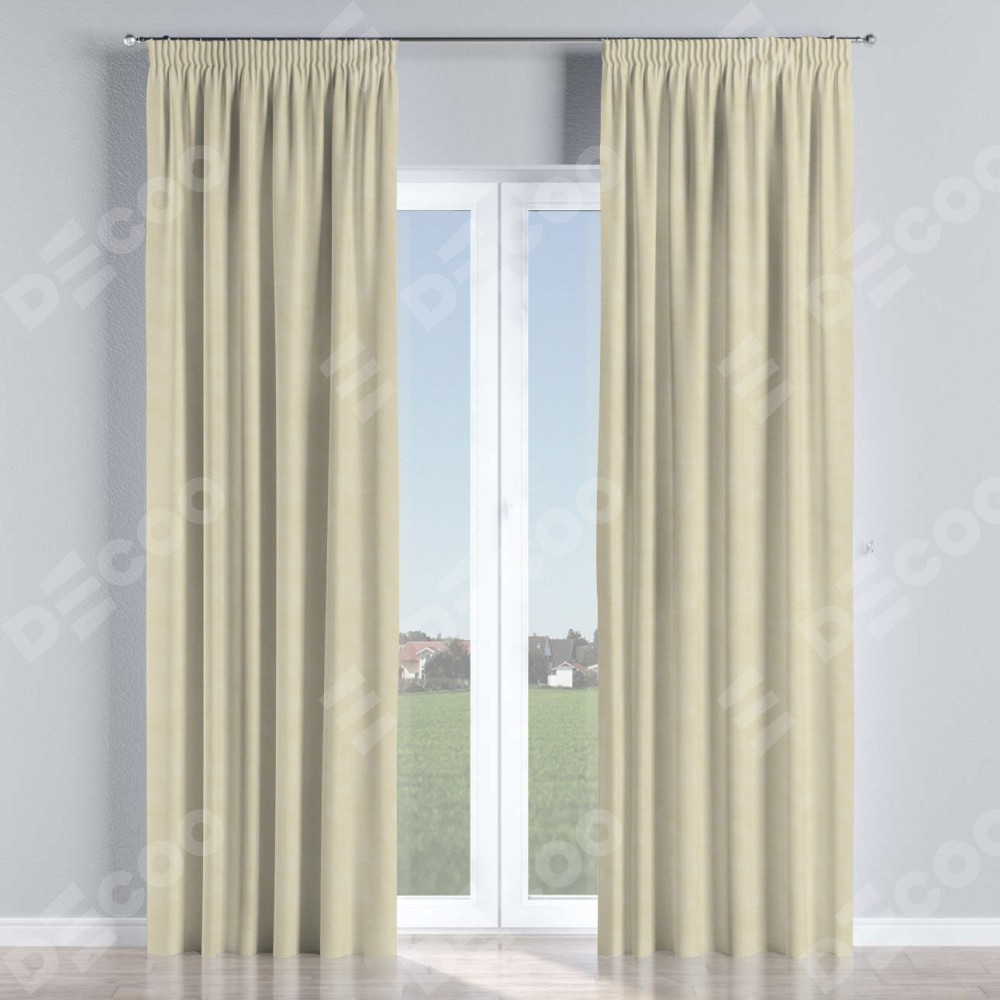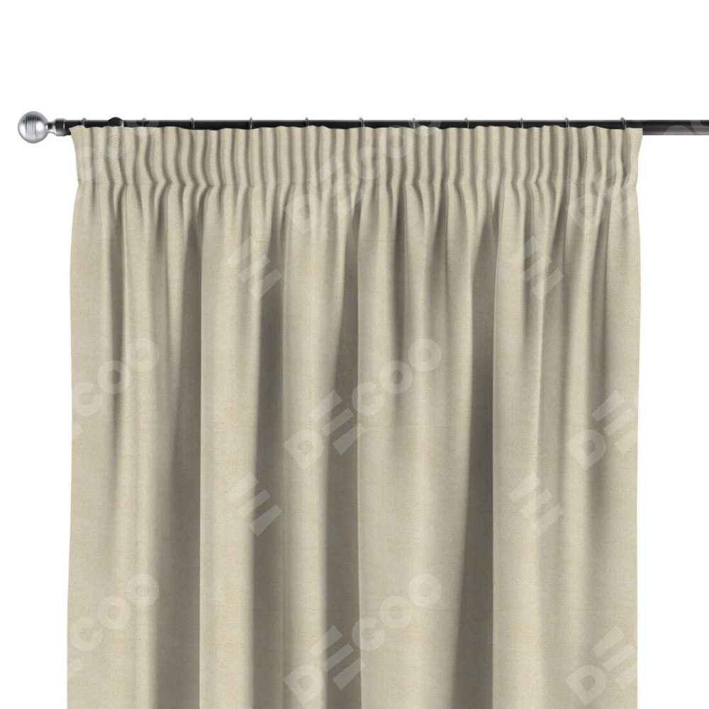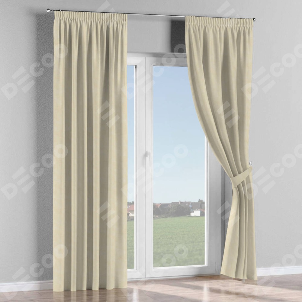 Комплект прямых штор, от производителя «Cortin», пошиты из ткани лён димаут бежевый, артикул ткани 83023. С изнаночной стороны в верхней части штор пристрачивается шторная лента с декоративными складками «Карандаш». Для создания элегантных складок прямые шторы шьются по стандарту с коэффициентом 1:2 (на 100 см. ширины проёма 200 см. ширины ткани).