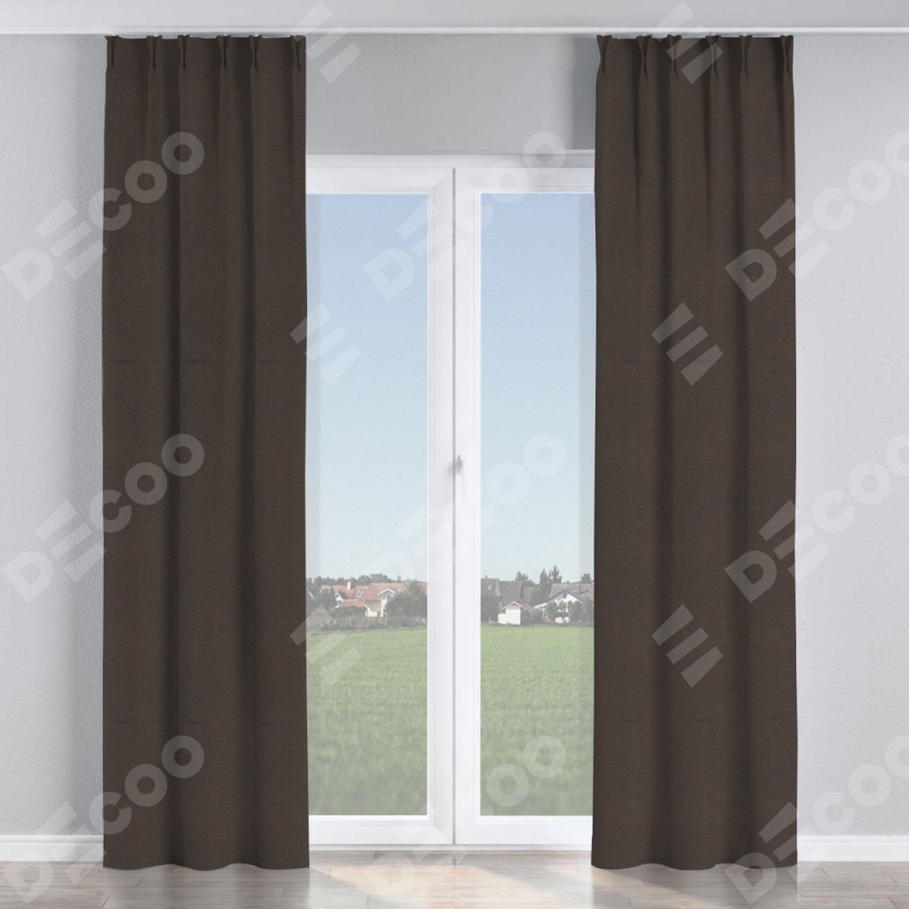 Комплект прямых штор, от производителя «Cortin», пошиты из ткани лён димаут венге, артикул ткани 85410. С изнаночной стороны в верхней части штор пристрачивается шторная лента с декоративными складками «Кустик». Для создания элегантных складок прямые шторы шьются по стандарту с коэффициентом 1:2 (на 100 см. ширины проёма 200 см. ширины ткани).
