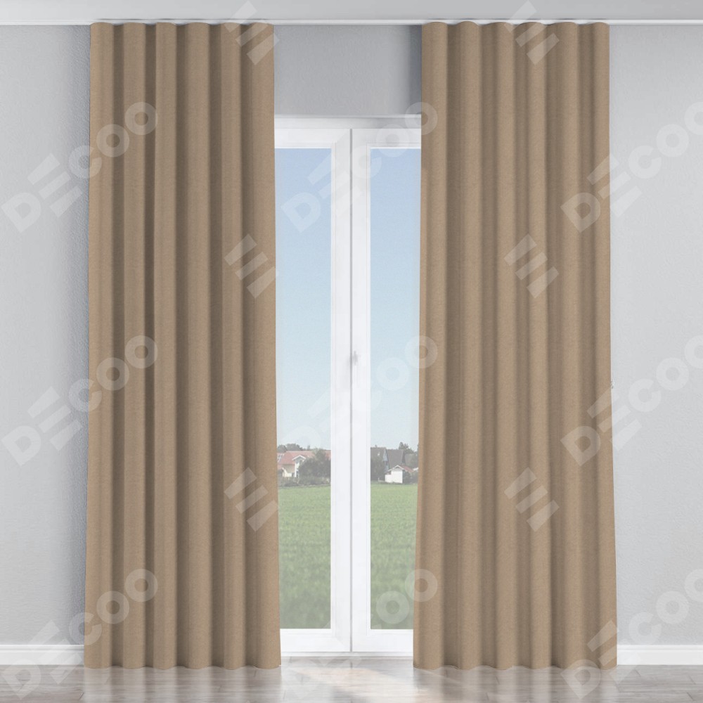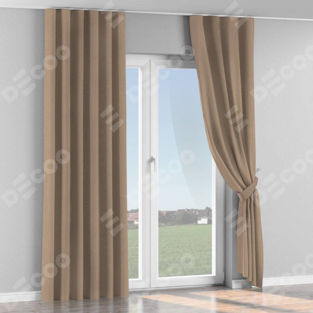 Комплект прямых штор, от производителя «Cortin», пошиты из ткани лён димаут светло-бежевый, артикул ткани 00002. С изнаночной стороны в верхней части штор пристрачивается шторная лента с декоративными складками «Волна». Для создания элегантных складок прямые шторы шьются по стандарту с коэффициентом 1:2 (на 100 см. ширины проёма 200 см. ширины ткани).