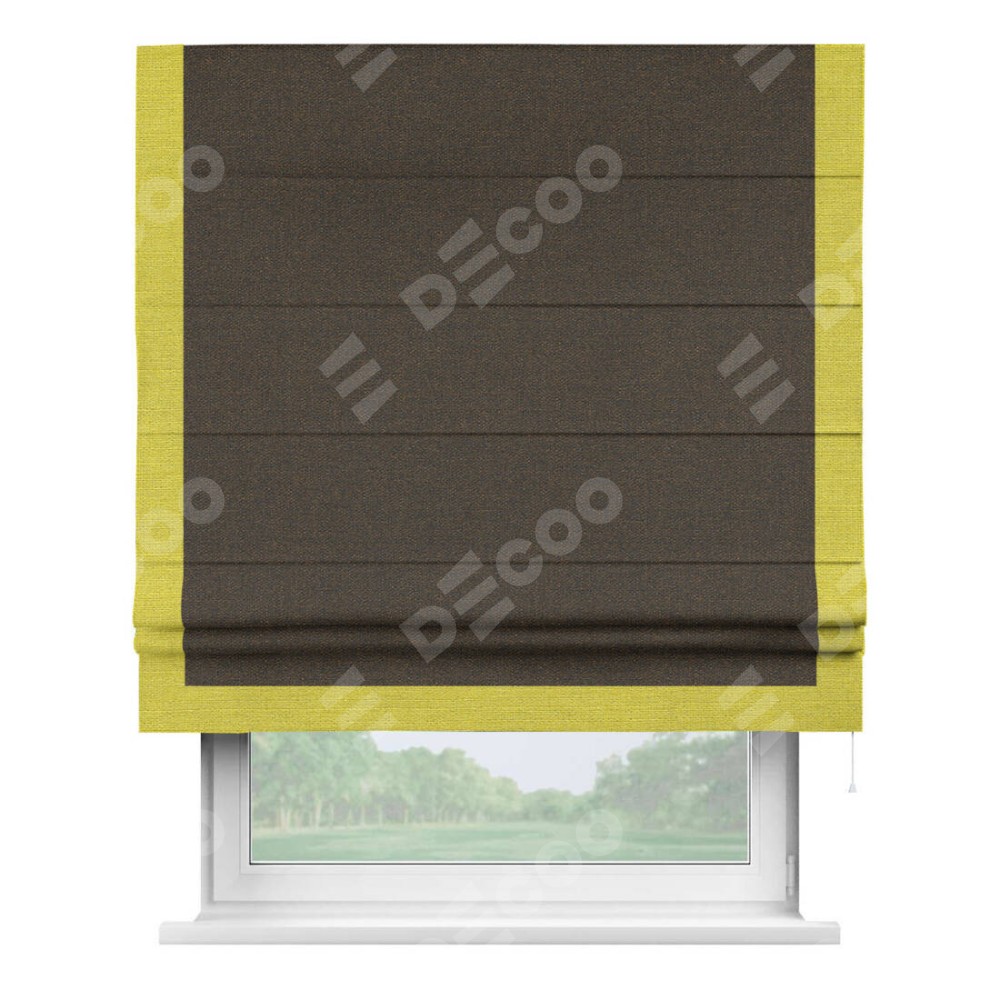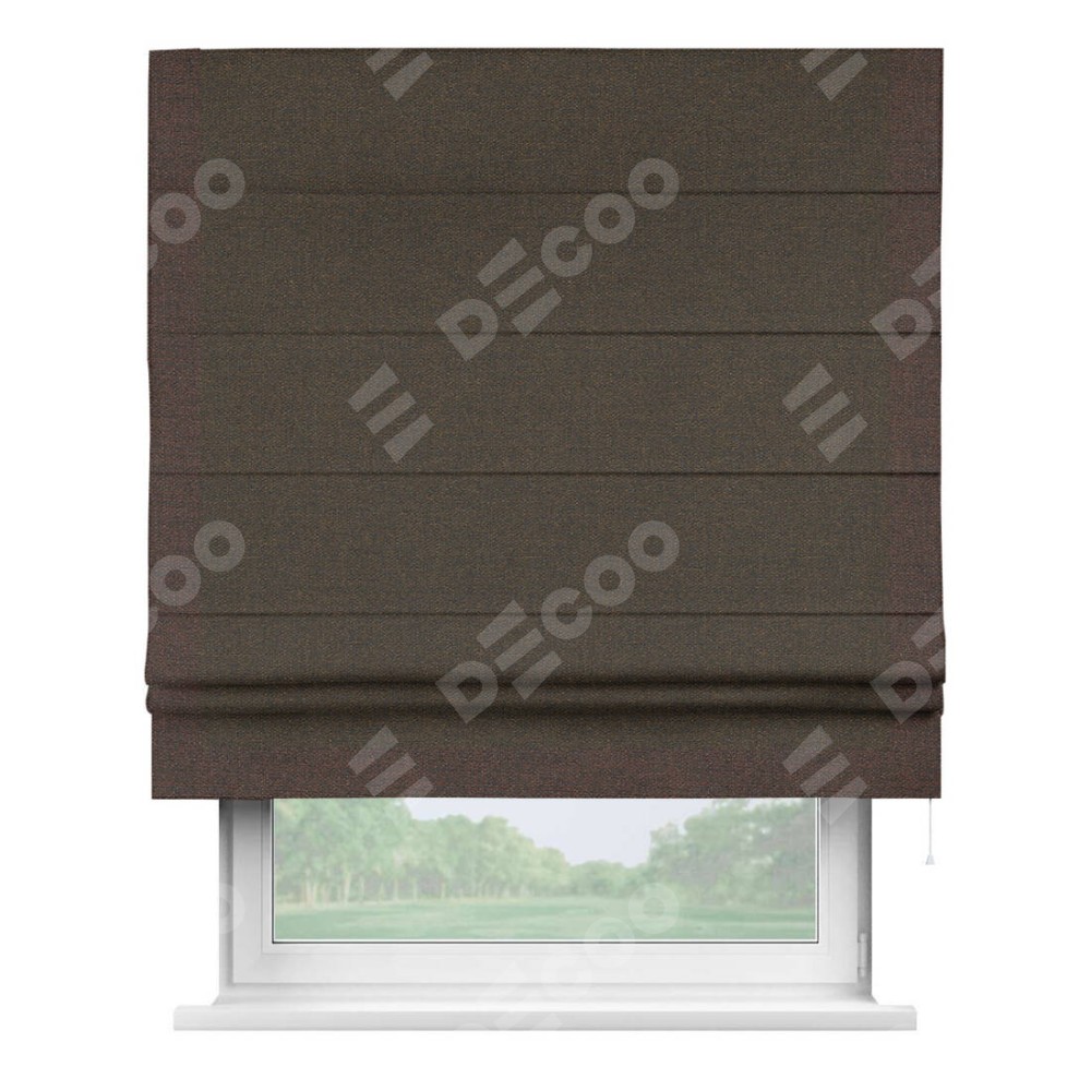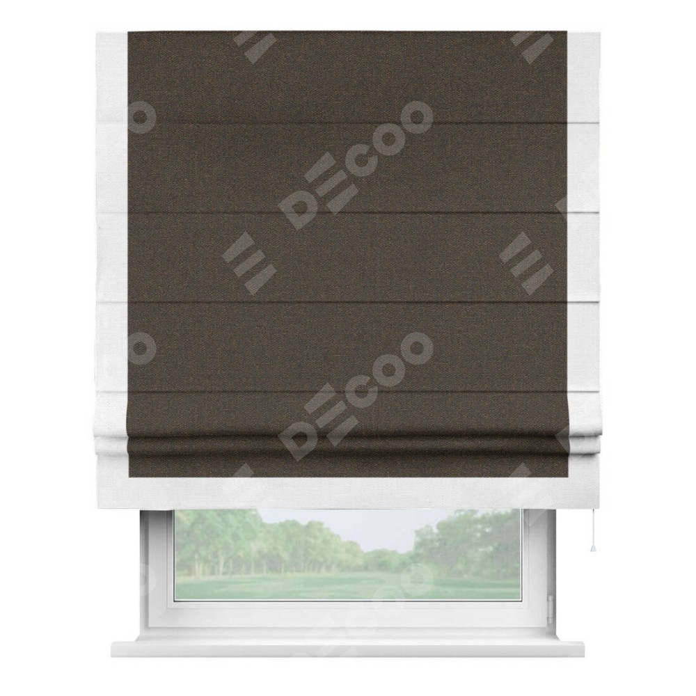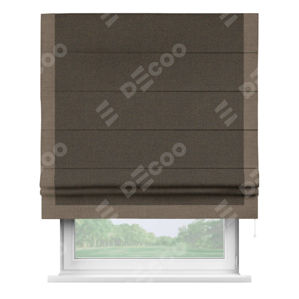 Римская штора производителя «Cortin», используется для проёма, пошита из ткани лён темно-коричневый, артикул 53444. Отделка шторы кантом «Виктория», ткань для канта используется из льна разной расцветки на выбор. Имеет универсальный механизм и подходит для монтажа: на потолок, на стену и в нишу.