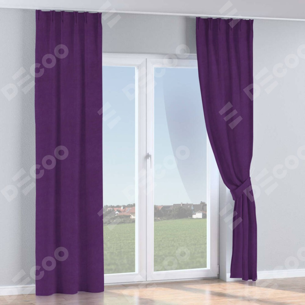 Комплект прямых штор, от производителя «Cortin», пошиты из ткани вельвет тёмно-фиолетовый, артикул ткани 17753. С изнаночной стороны в верхней части штор пристрачивается шторная лента с декоративными складками «Кустик». Для создания элегантных складок прямые шторы шьются по стандарту с коэффициентом 1:2 (на 100 см. ширины проёма 200 см. ширины ткани).