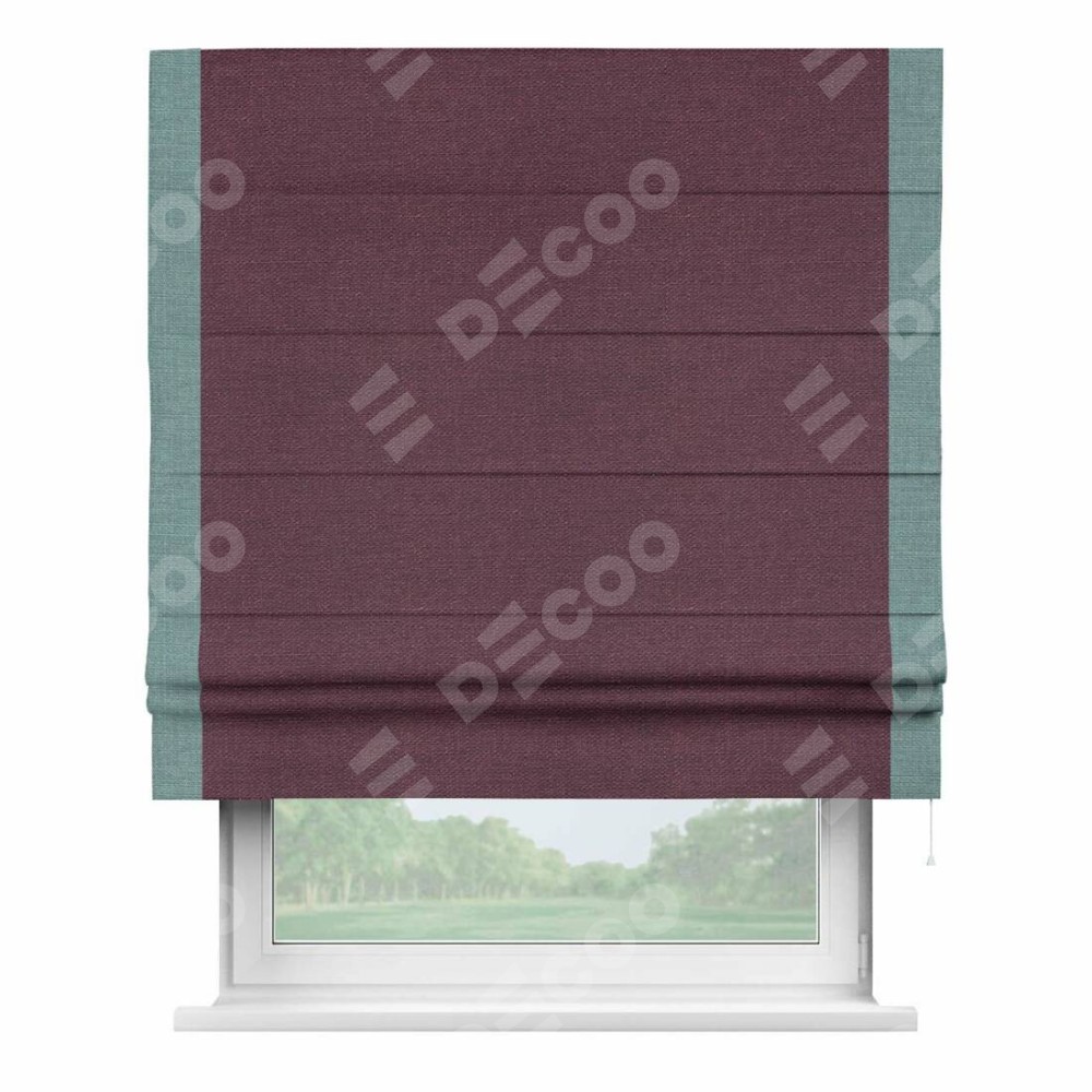 Римская штора производителя «Cortin», используется для проёма, пошита из ткани лён фиолетовый, артикул 85907. Отделка шторы кантом «Стрим Дуо», ткань для канта используется из льна разной расцветки на выбор. Имеет универсальный механизм и подходит для монтажа: на потолок, на стену и в нишу.
