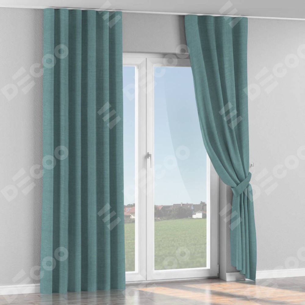 Комплект прямых штор, от производителя «Cortin», пошиты из ткани лён голубой, артикул ткани 74736. С изнаночной стороны в верхней части штор пристрачивается шторная лента с декоративными складками «Волна». Для создания элегантных складок прямые шторы шьются по стандарту с коэффициентом 1:2 (на 100 см. ширины проёма 200 см. ширины ткани).