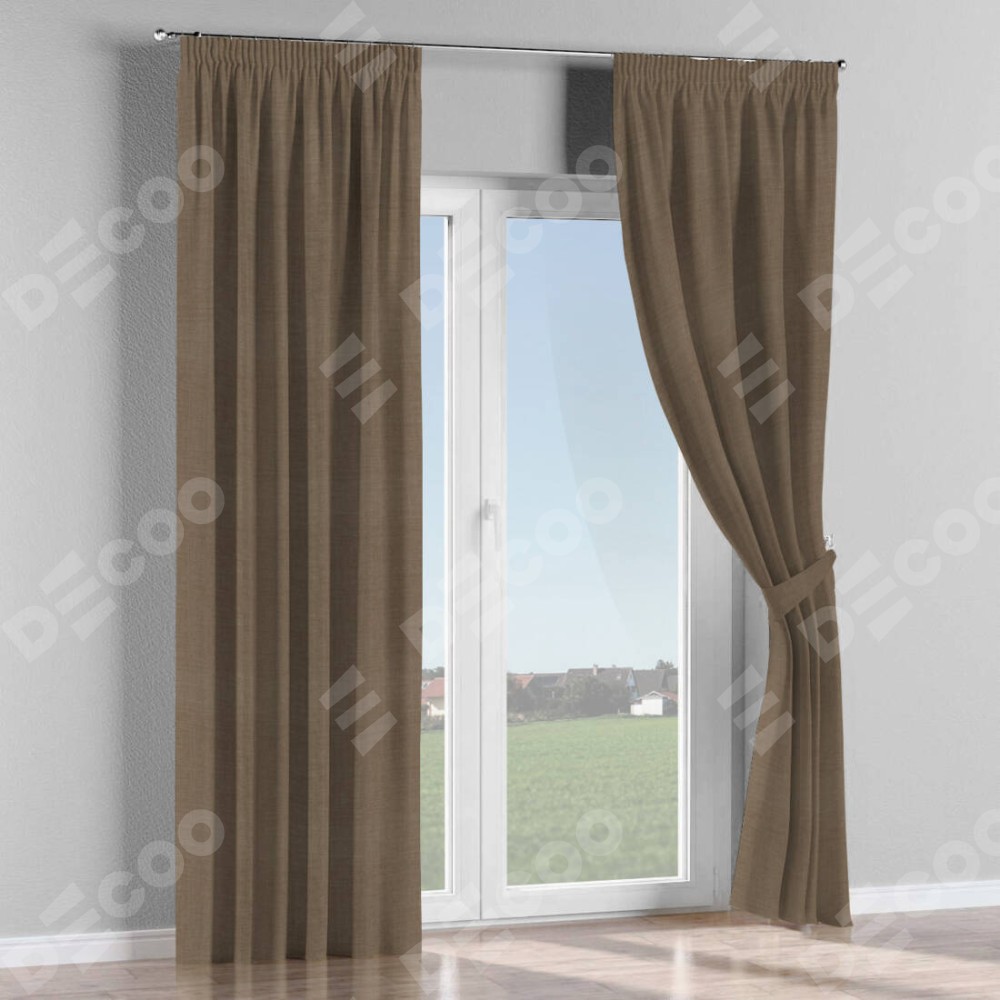 Комплект прямых штор, от производителя «Cortin», пошиты из ткани лён мокко, артикул ткани 7444. С изнаночной стороны в верхней части штор пристрачивается шторная лента с декоративными складками «Карандаш». Для создания элегантных складок прямые шторы шьются по стандарту с коэффициентом 1:2 (на 100 см. ширины проёма 200 см. ширины ткани).