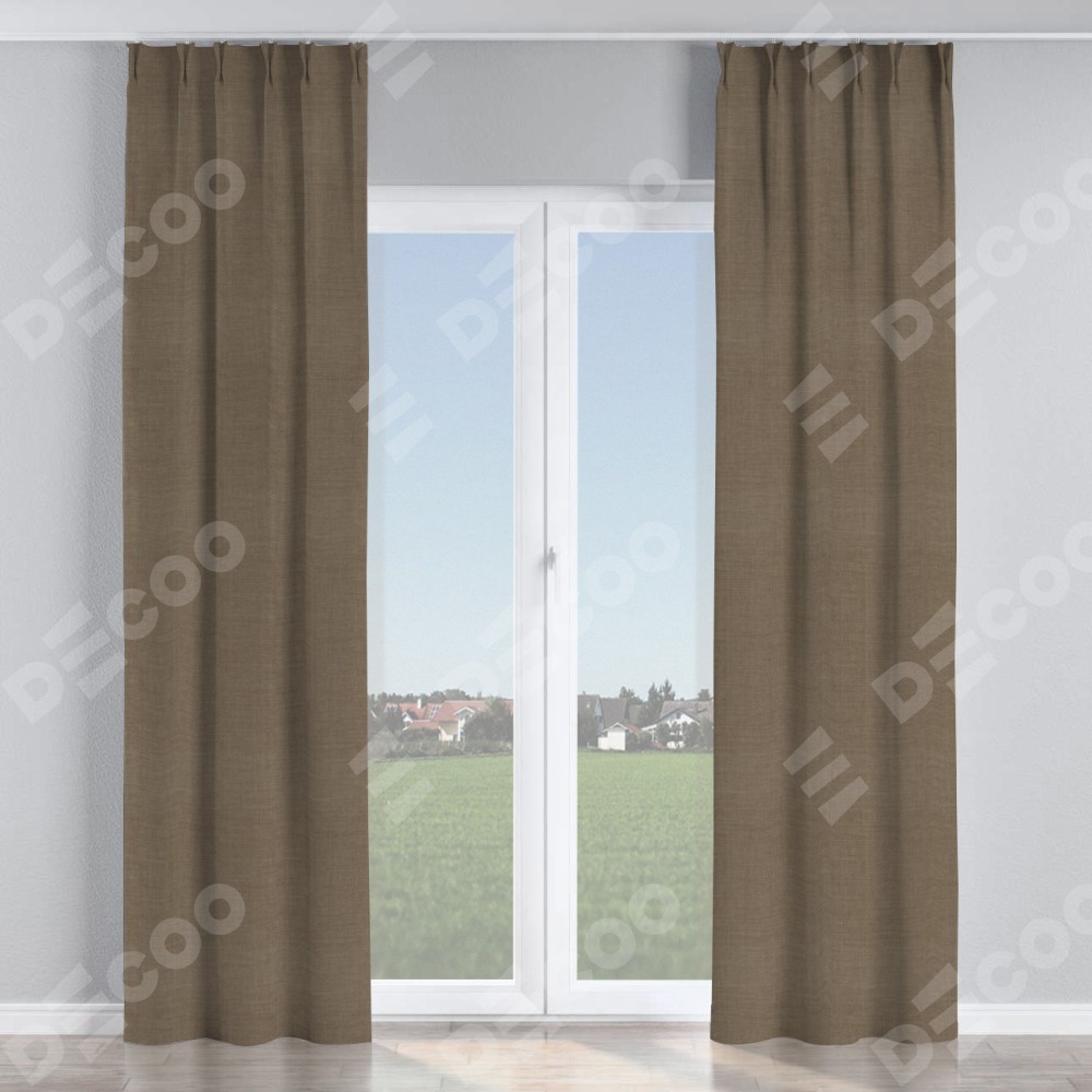 Комплект прямых штор, от производителя «Cortin», пошиты из ткани лён мокко, артикул ткани 7444. С изнаночной стороны в верхней части штор пристрачивается шторная лента с декоративными складками «Кустик». Для создания элегантных складок прямые шторы шьются по стандарту с коэффициентом 1:2 (на 100 см. ширины проёма 200 см. ширины ткани).