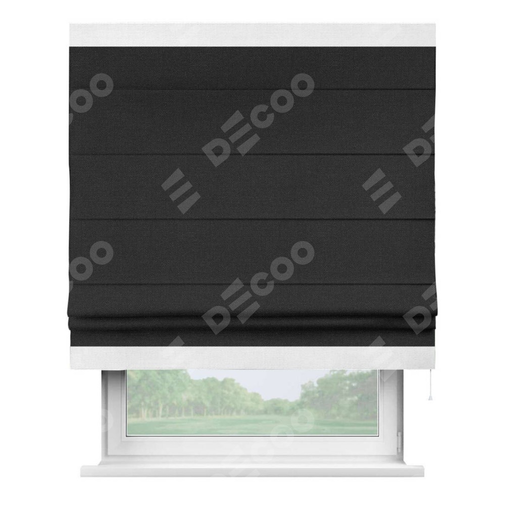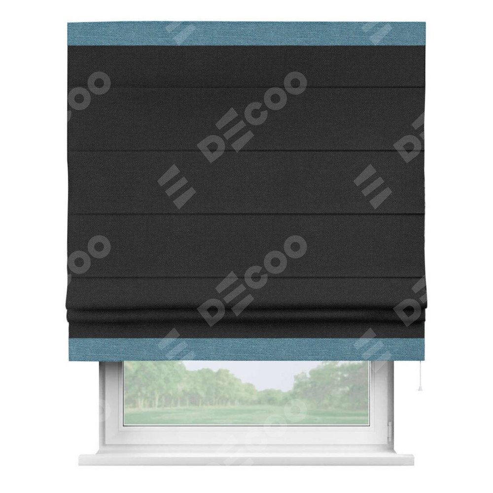 Римская штора производителя «Cortin», используется для проёма, пошита из ткани лён черный, артикул 85927. Отделка шторы кантом «Горизонт», ткань для канта используется из льна разной расцветки на выбор. Имеет универсальный механизм и подходит для монтажа: на потолок, на стену и в нишу.