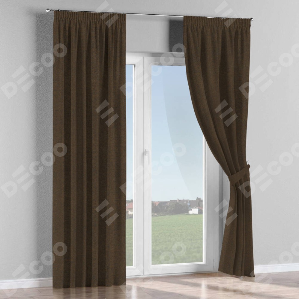 Комплект прямых штор, от производителя «Cortin», пошиты из ткани лён тёмно-коричневый, артикул ткани 53444. С изнаночной стороны в верхней части штор пристрачивается шторная лента с декоративными складками «Карандаш». Для создания элегантных складок прямые шторы шьются по стандарту с коэффициентом 1:2 (на 100 см. ширины проёма 200 см. ширины ткани).