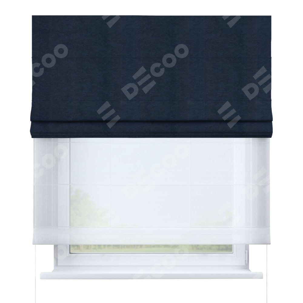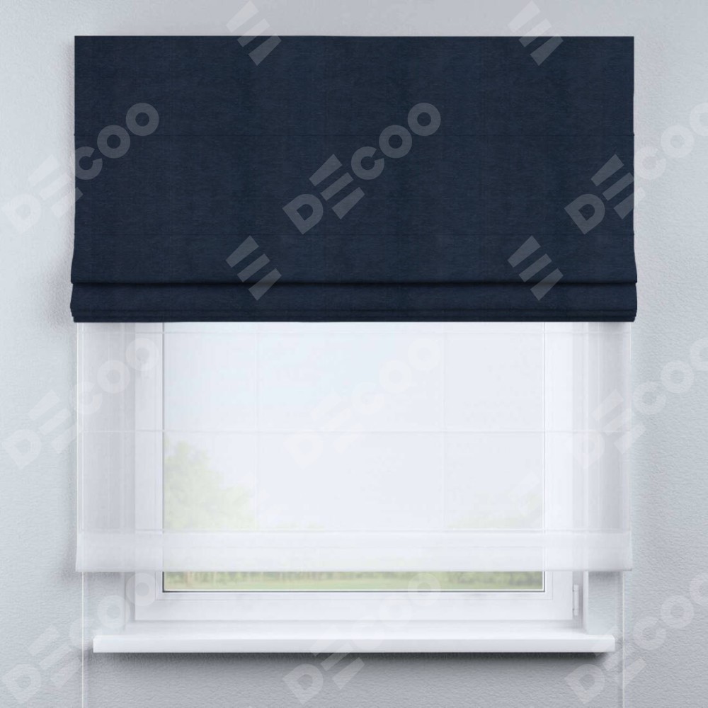 Римская штора день-ночь производителя «Cortin», используется для проёма, пошита из двух полотен, с лицевой стороны софт однотонный тёмно-синий артикул 33111, вторая ткань тюль (по стандарту комплектуется тюль белого цвета артикул V-01). Имеет универсальный механизм и подходит для монтажа: на потолок, на стену и в нишу.