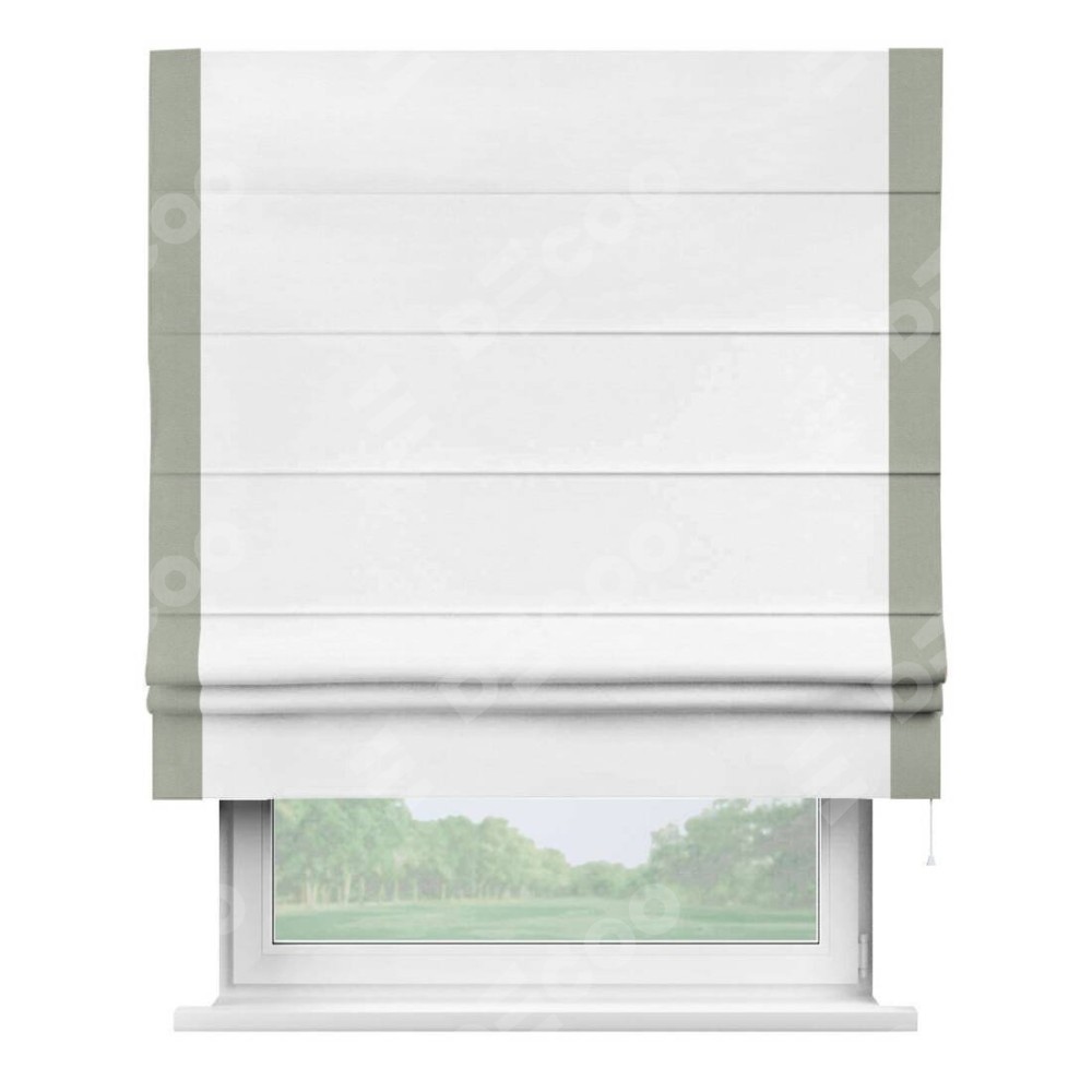 Римская штора производителя «Cortin», используется для проёма, пошита из ткани вельвет дымчато-белый, артикул ткани 85535. Отделка шторы кантом «Стрим Дуо», ткань для канта используется из вельвета разной расцветки на выбор. Имеет универсальный механизм и подходит для монтажа: на потолок, на стену и в нишу.