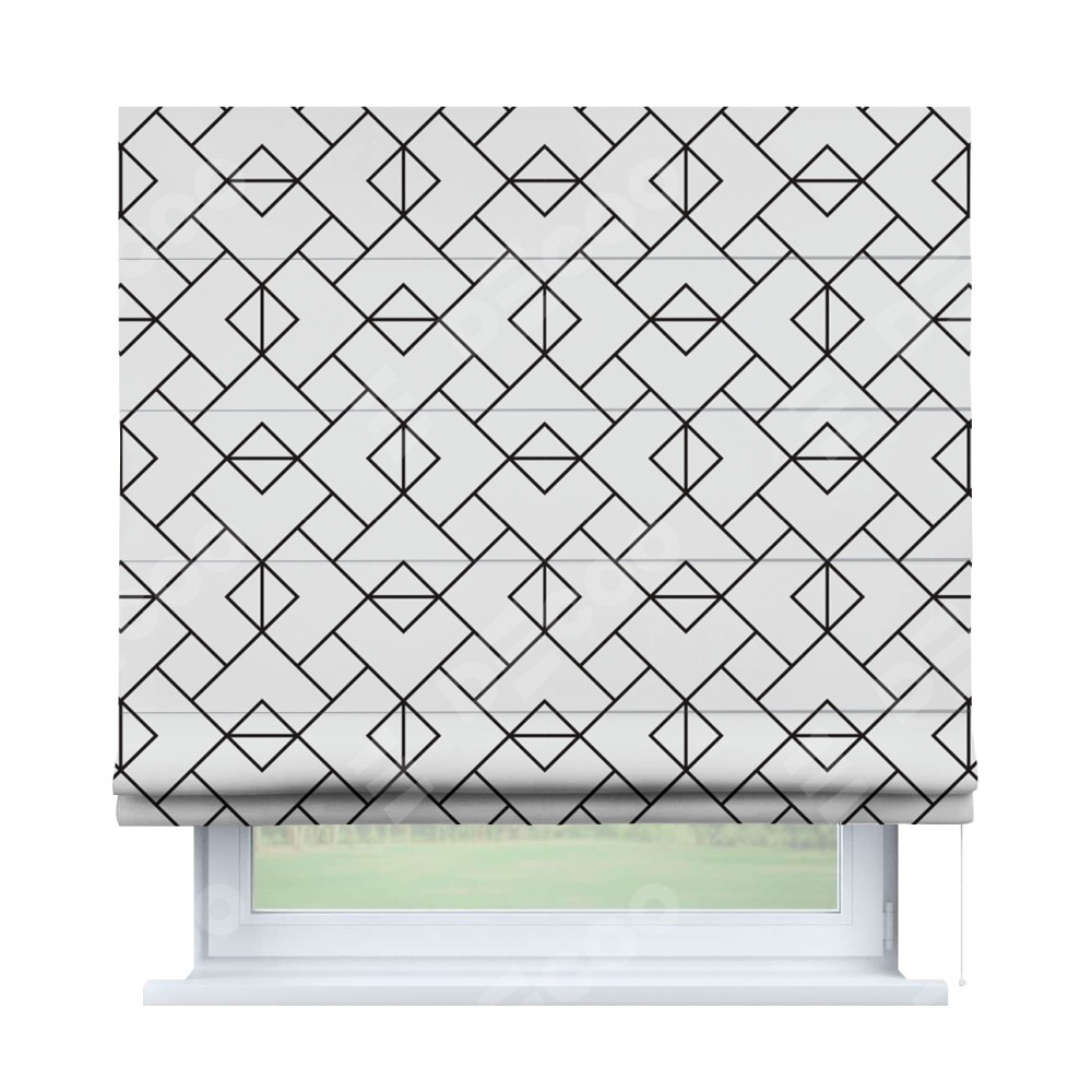 Римская штора производителя «Cortin», используется для проёма, пошита из ткани блэкаут с нанесением сублимационной печати «Геометрический орнамент». Имеет универсальный механизм и подходит для монтажа: на потолок, на стену и в нишу.