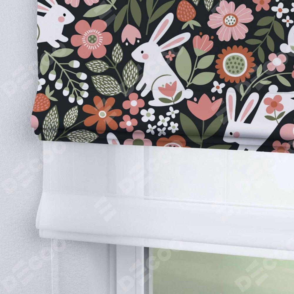 Римская штора день-ночь производителя «Cortin», используется для проёма, пошита из двух полотен, с лицевой блэкаут с нанесением сублимационной печати «Зайчики в цветнике», вторая ткань тюль (по стандарту комплектуется тюль белого цвета артикул V-01). Имеет универсальный механизм и подходит для монтажа: на потолок, на стену и в нишу.