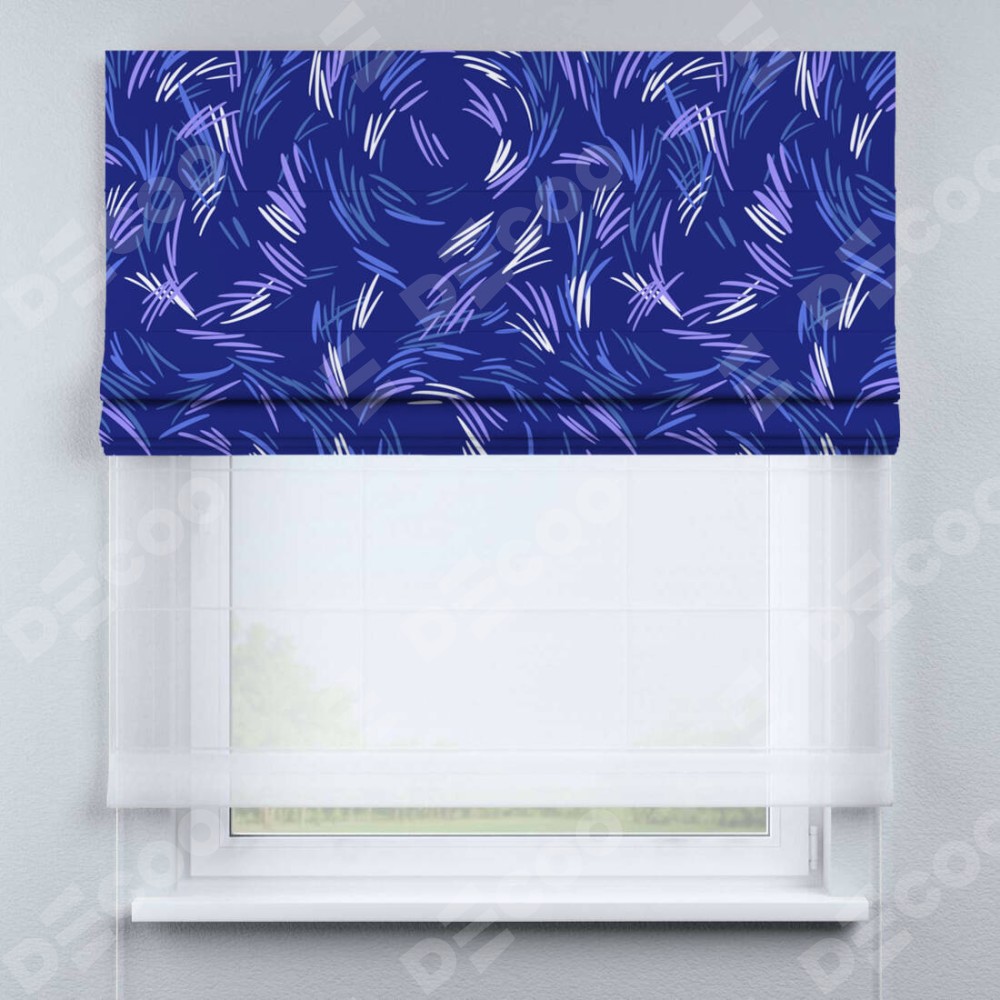 Римская штора день-ночь производителя «Cortin», используется для проёма, пошита из двух полотен, с лицевой блэкаут с нанесением сублимационной печати «Синяя абстракция», вторая ткань тюль (по стандарту комплектуется тюль белого цвета артикул V-01). Имеет универсальный механизм и подходит для монтажа: на потолок, на стену и в нишу.