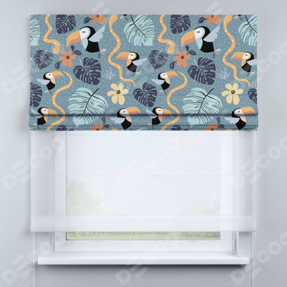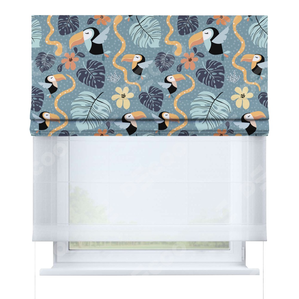 Римская штора день-ночь производителя «Cortin», используется для проёма, пошита из двух полотен, с лицевой блэкаут с нанесением сублимационной печати «Экзотические птицы», вторая ткань тюль (по стандарту комплектуется тюль белого цвета артикул V-01). Имеет универсальный механизм и подходит для монтажа: на потолок, на стену и в нишу.