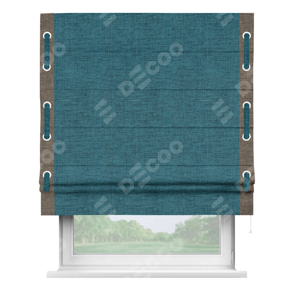 Римская штора производителя «Cortin», используется для проёма, пошита из ткани рогожка димаут синий, артикул 80422. Отделка шторы кантом «Стрим Дуо» на кантах расположены люверсы с пояском, ткань для канта используется из рогожки разной расцветки на выбор. Ткань для пояска обычно используется из основной ткани шторы, а так же можно сделать из любой расцветки по желанию. Имеет универсальный механизм и подходит для монтажа: на потолок, на стену и в нишу.