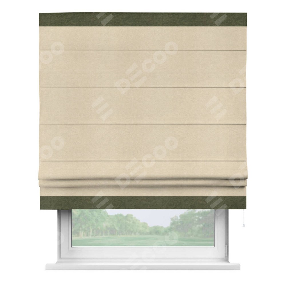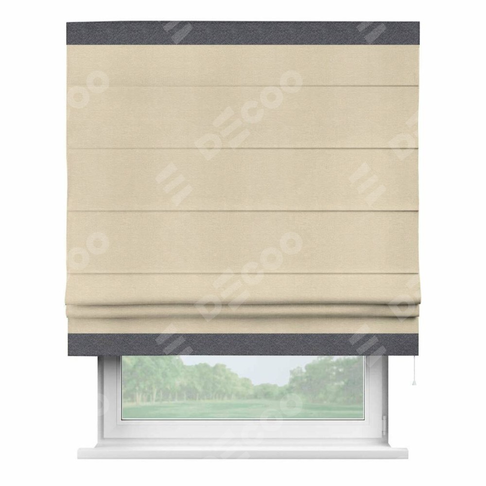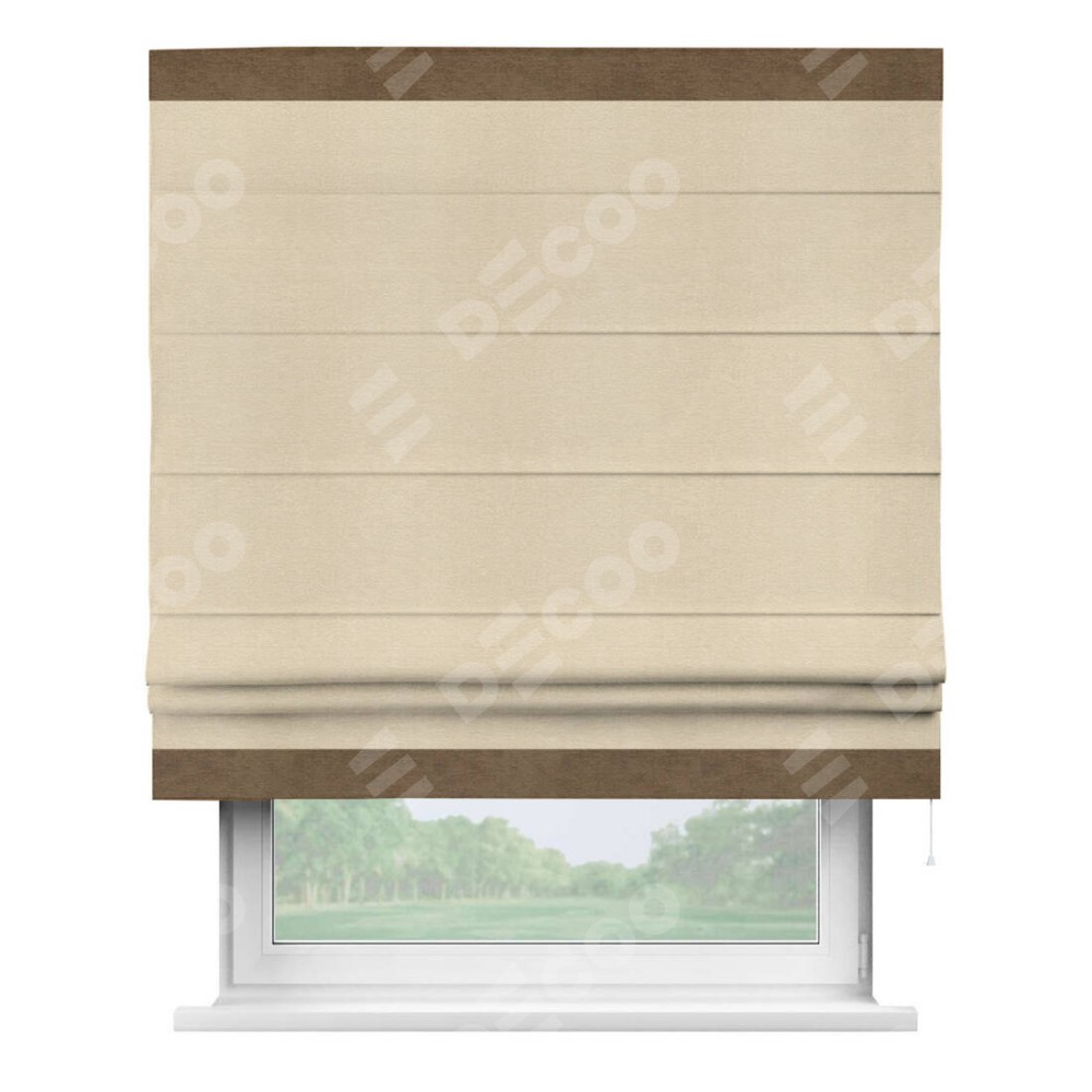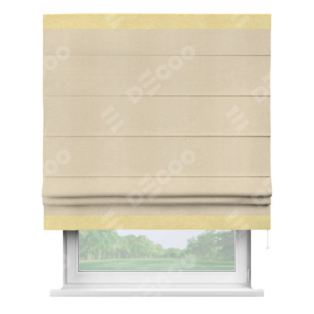Римская штора производителя «Cortin», используется для проёма, пошита из ткани софт однотонный бежевый лайт, артикул 33100. Отделка шторы кантом «Горизонт», ткань для канта используется из софта разной расцветки на выбор. Имеет универсальный механизм и подходит для монтажа: на потолок, на стену и в нишу.