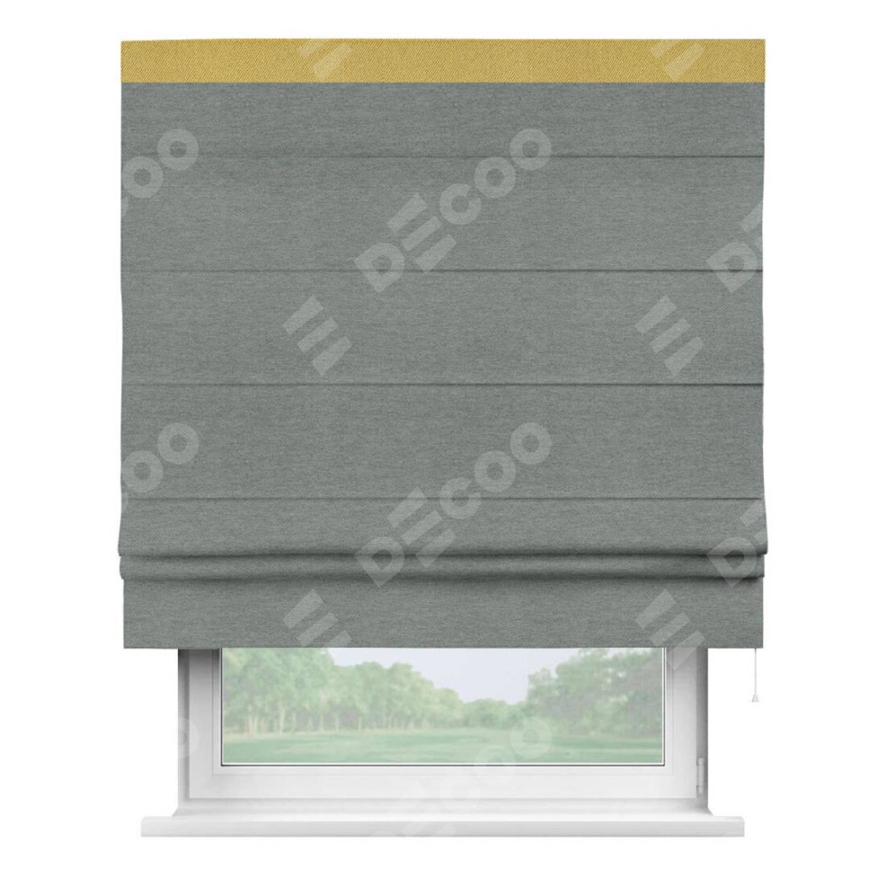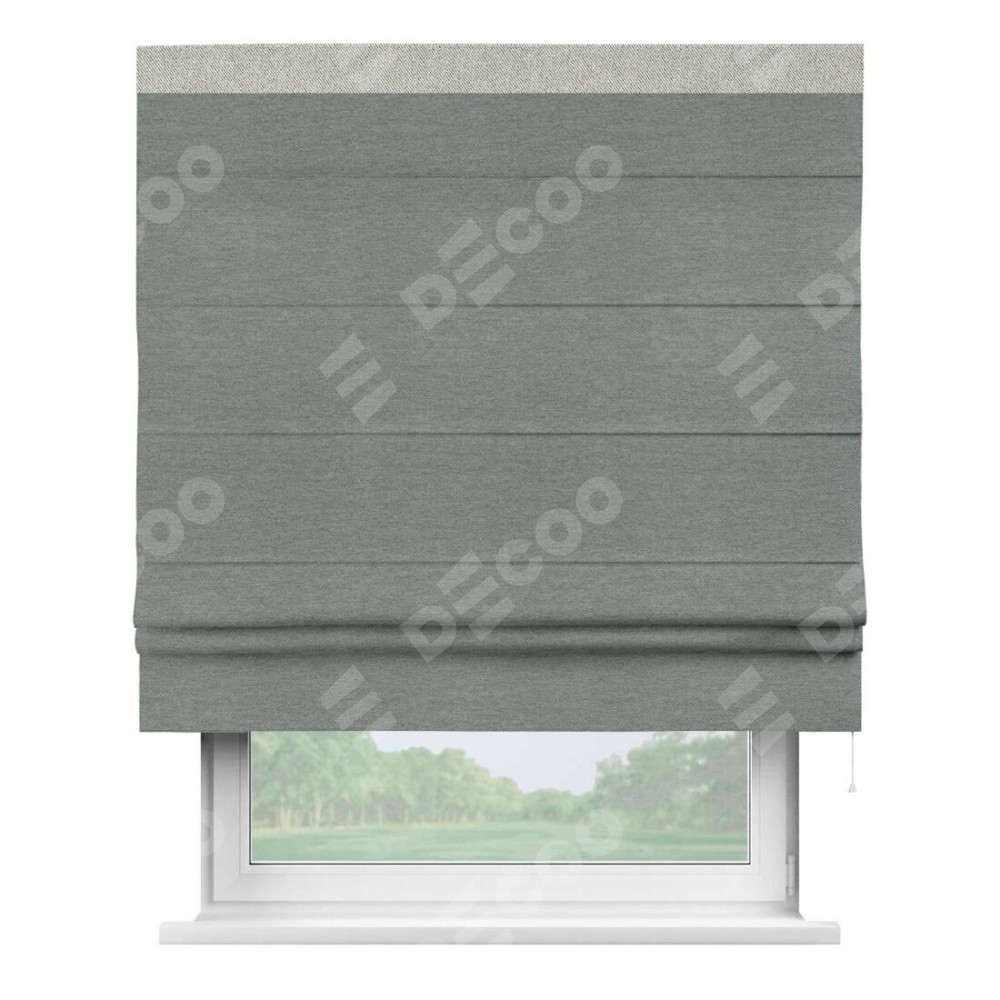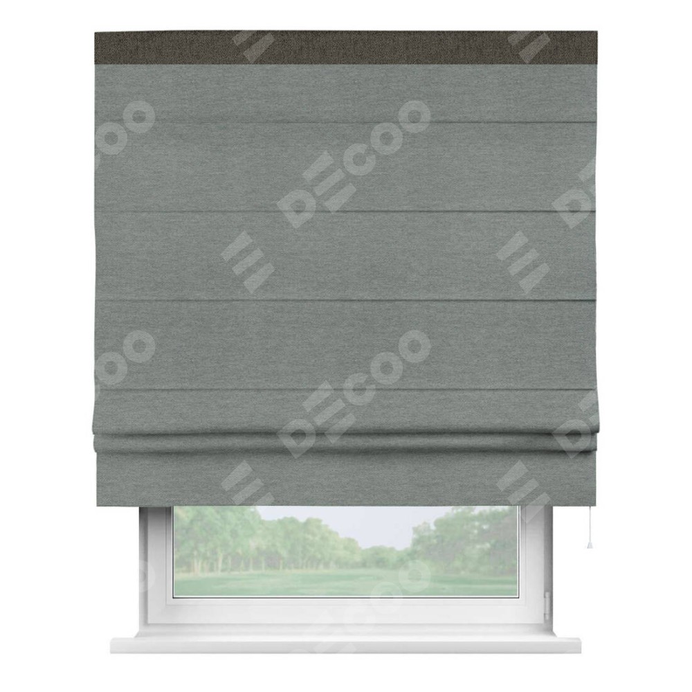 Римская штора производителя «Cortin», используется для проёма, пошита из ткани твид блэкаут серый, артикул 21577. Отделка шторы кантом «Кинг», ткань для канта используется из твида разной расцветки на выбор. Имеет универсальный механизм и подходит для монтажа: на потолок, на стену и в нишу.