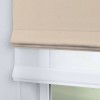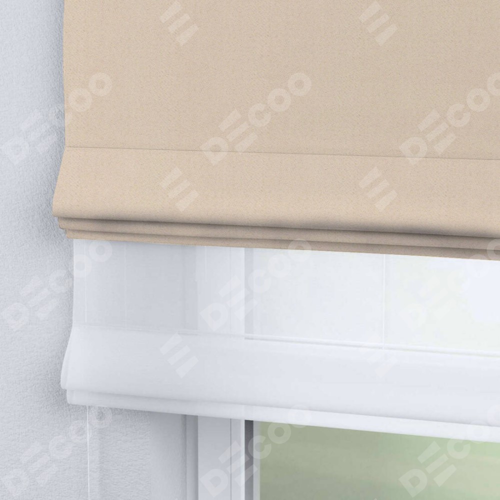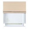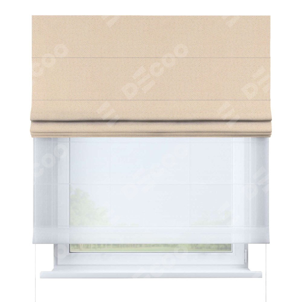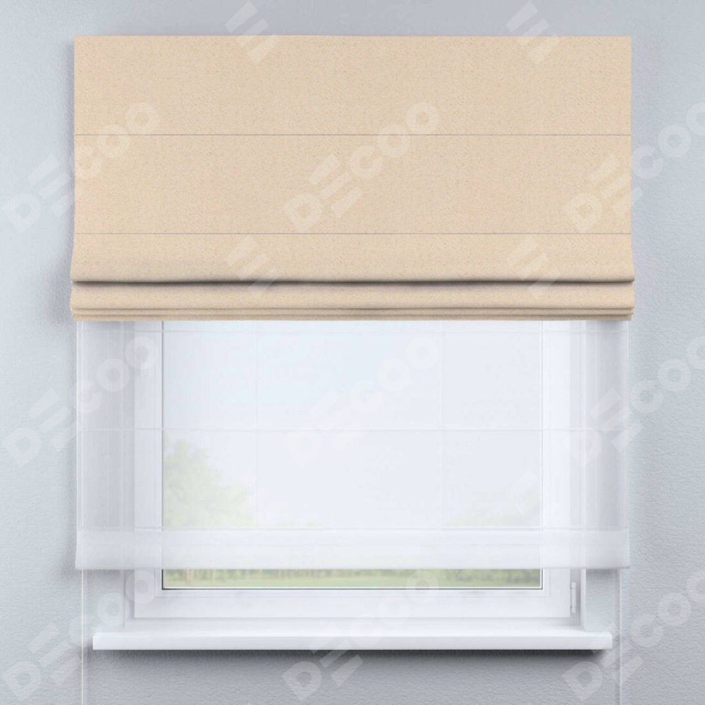Римская штора день-ночь производителя «Cortin», используется для проёма, пошита из двух полотен, с лицевой стороны блэкаут тиснение с блеском бежевый артикул 34627, вторая ткань тюль (по стандарту комплектуется тюль белого цвета артикул V-01). Изнаночная сторона основного материала черного цвета, что обеспечивает необходимую светонепроницаемость. Имеет универсальный механизм и подходит для монтажа: на потолок, на стену и в нишу.