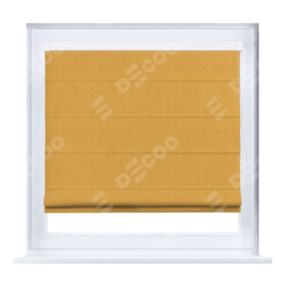 Римская штора кассетного типа, производителя «Cortin», устанавливается только на пластиковые окна и прилегает к стеклопакету, пошита из ткани из ткани блэкаут тиснение с блеском золотой, артикул 34626. Изнаночная сторона материала черного цвета, что обеспечивает необходимую светонепроницаемость.