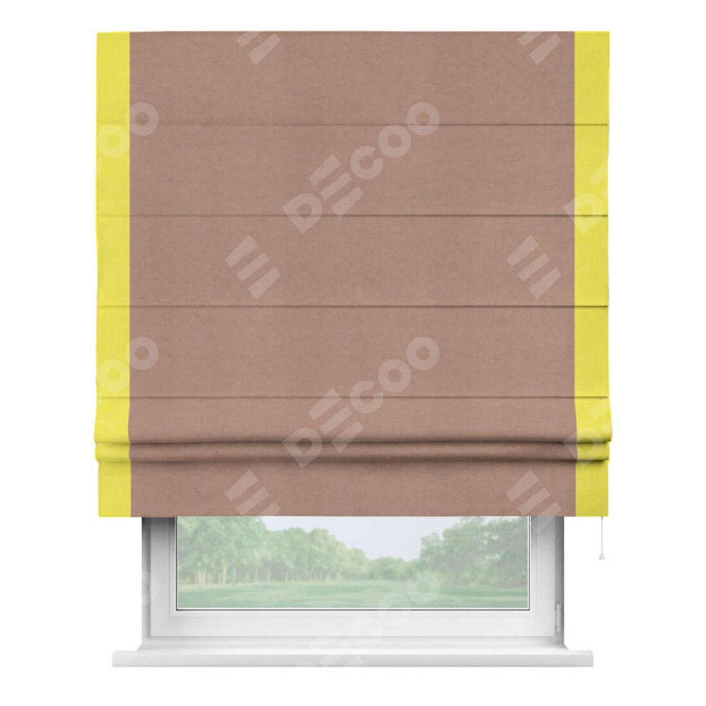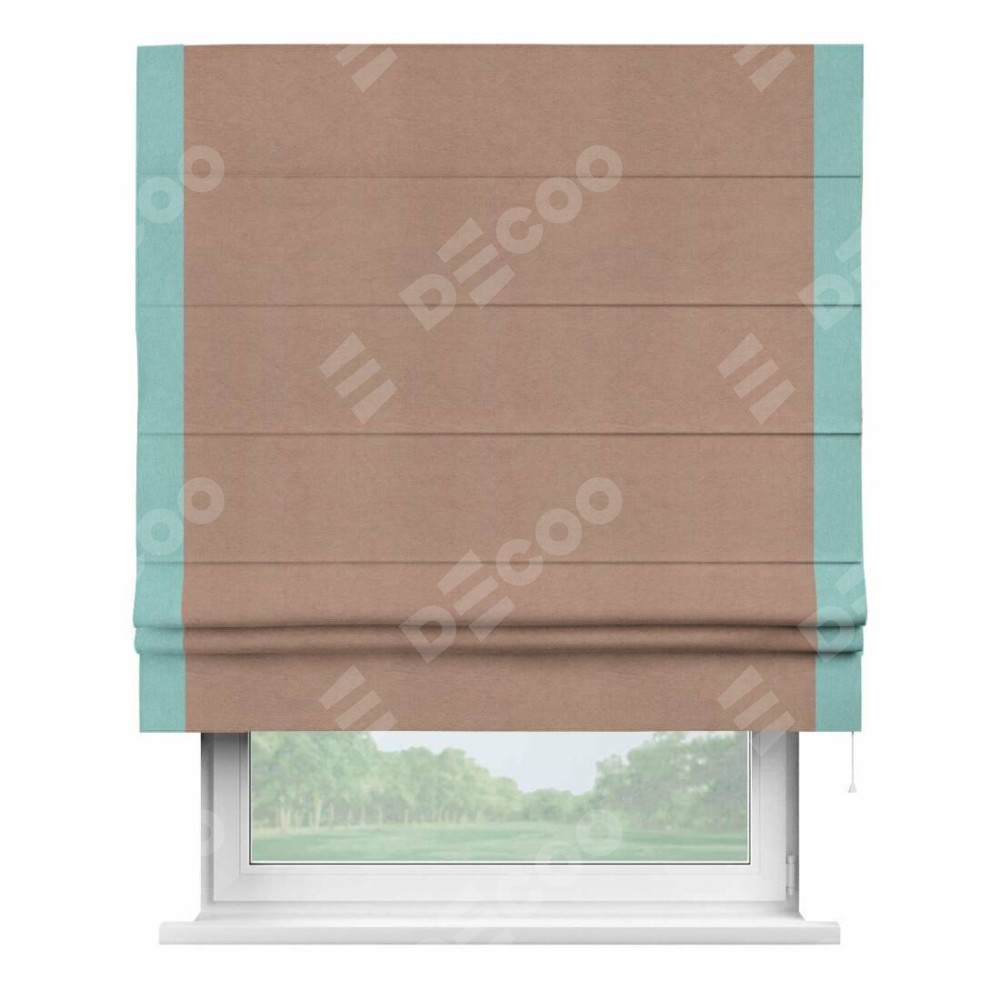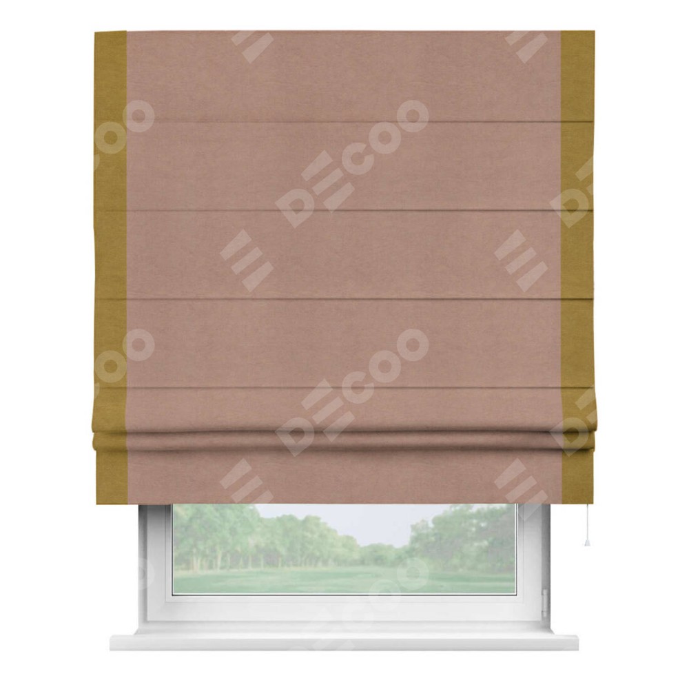 Римская штора производителя «Cortin», используется для проёма, пошита из ткани вельвет брусничный джем, артикул ткани 17750. Отделка шторы кантом «Стрим Дуо», ткань для канта используется из вельвета разной расцветки на выбор. Имеет универсальный механизм и подходит для монтажа: на потолок, на стену и в нишу.