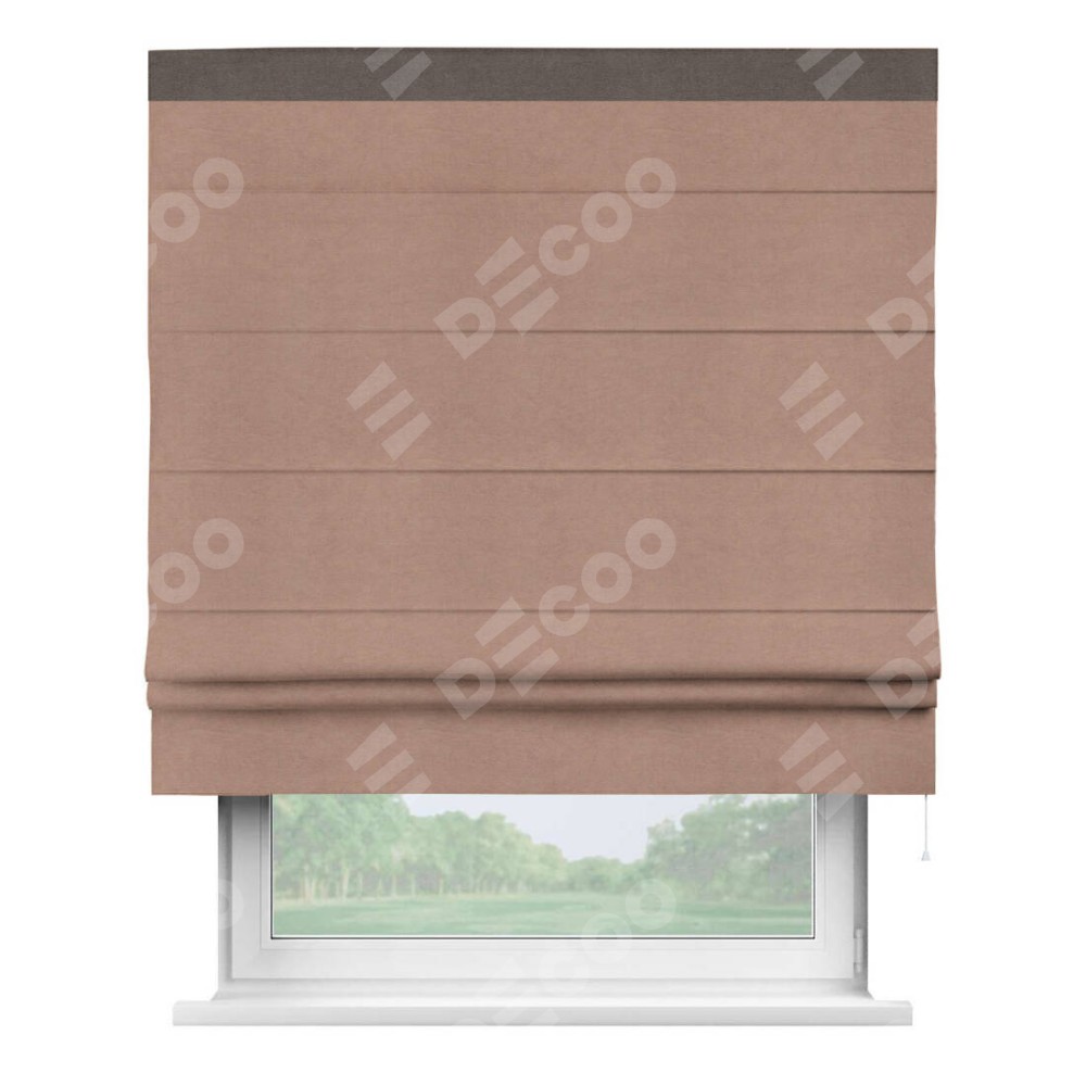 Римская штора производителя «Cortin», используется для проёма, пошита из ткани вельвет брусничный джем, артикул ткани 17750. Отделка шторы кантом «Кинг», ткань для канта используется из вельвета разной расцветки на выбор. Имеет универсальный механизм и подходит для монтажа: на потолок, на стену и в нишу.