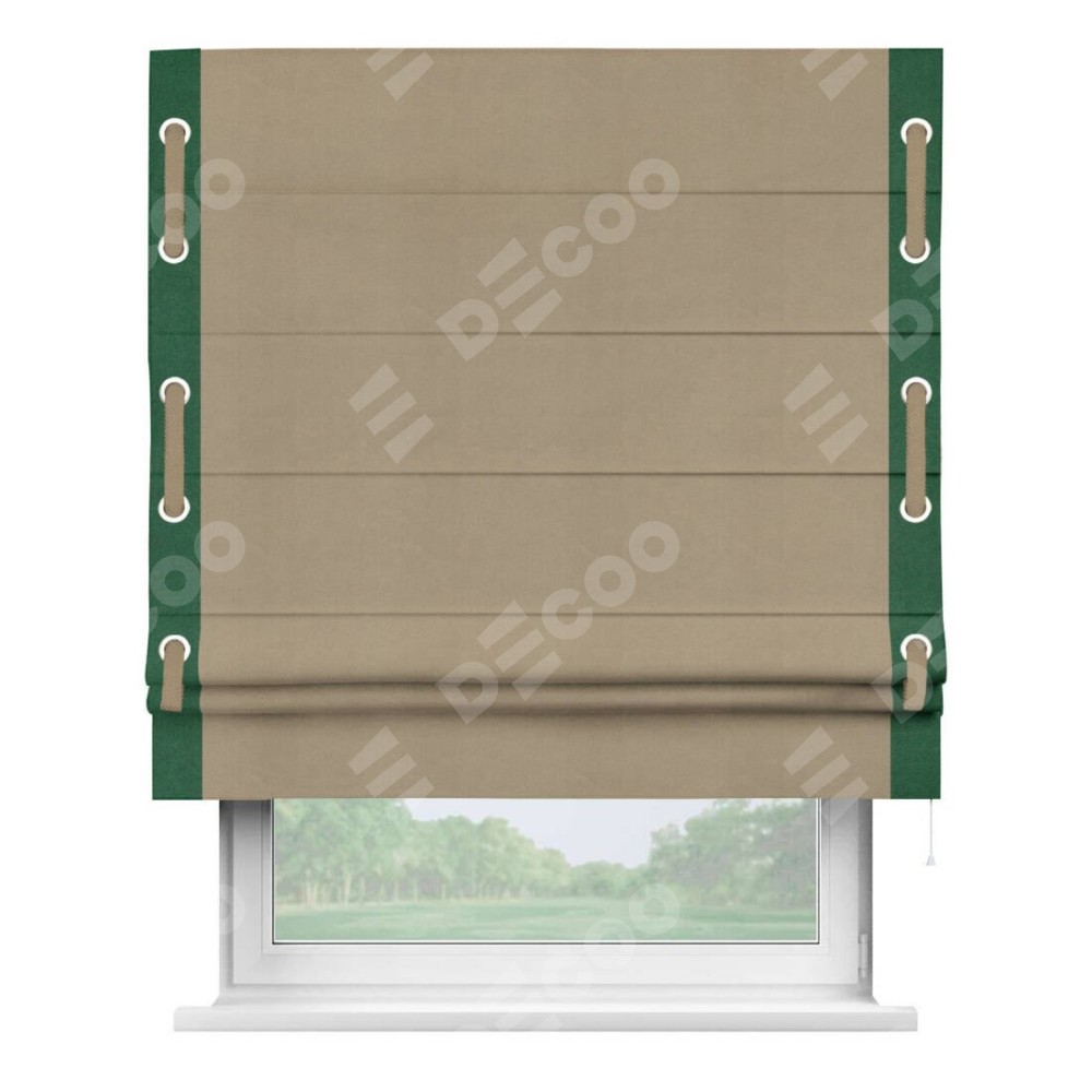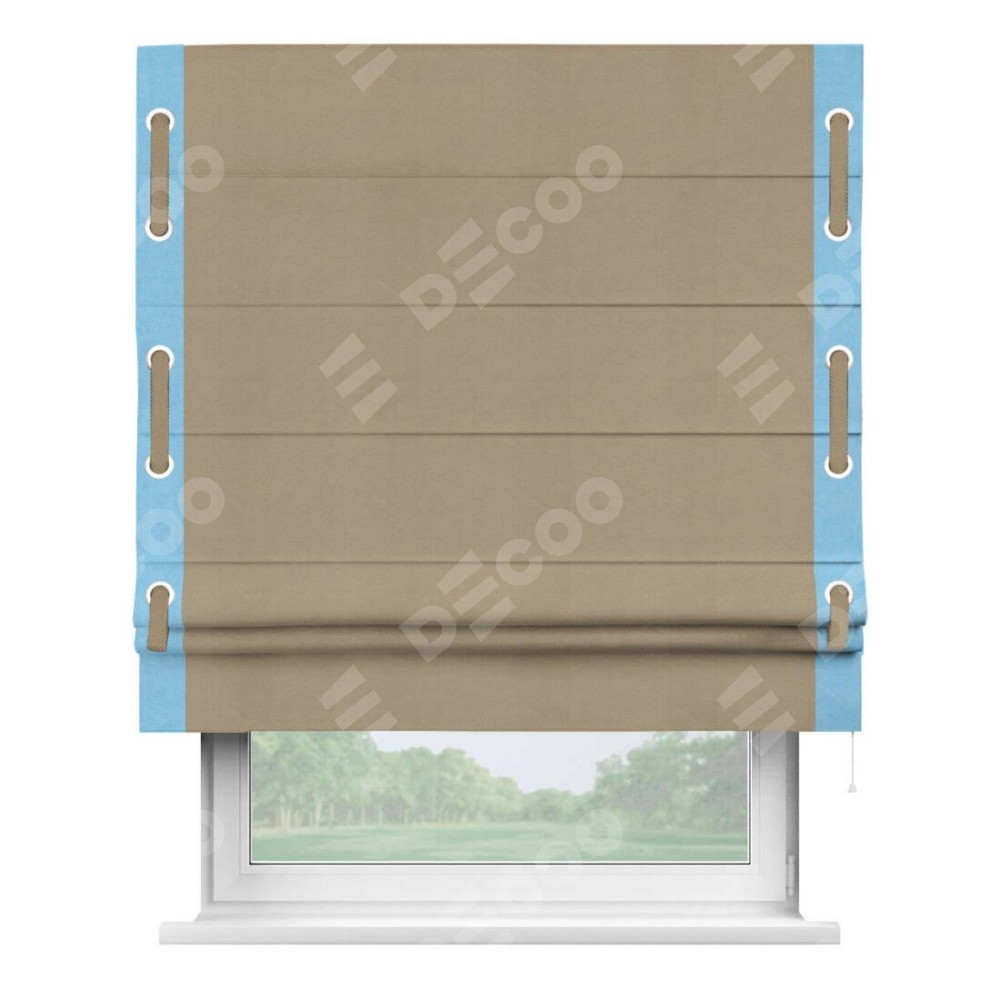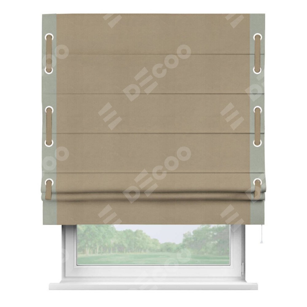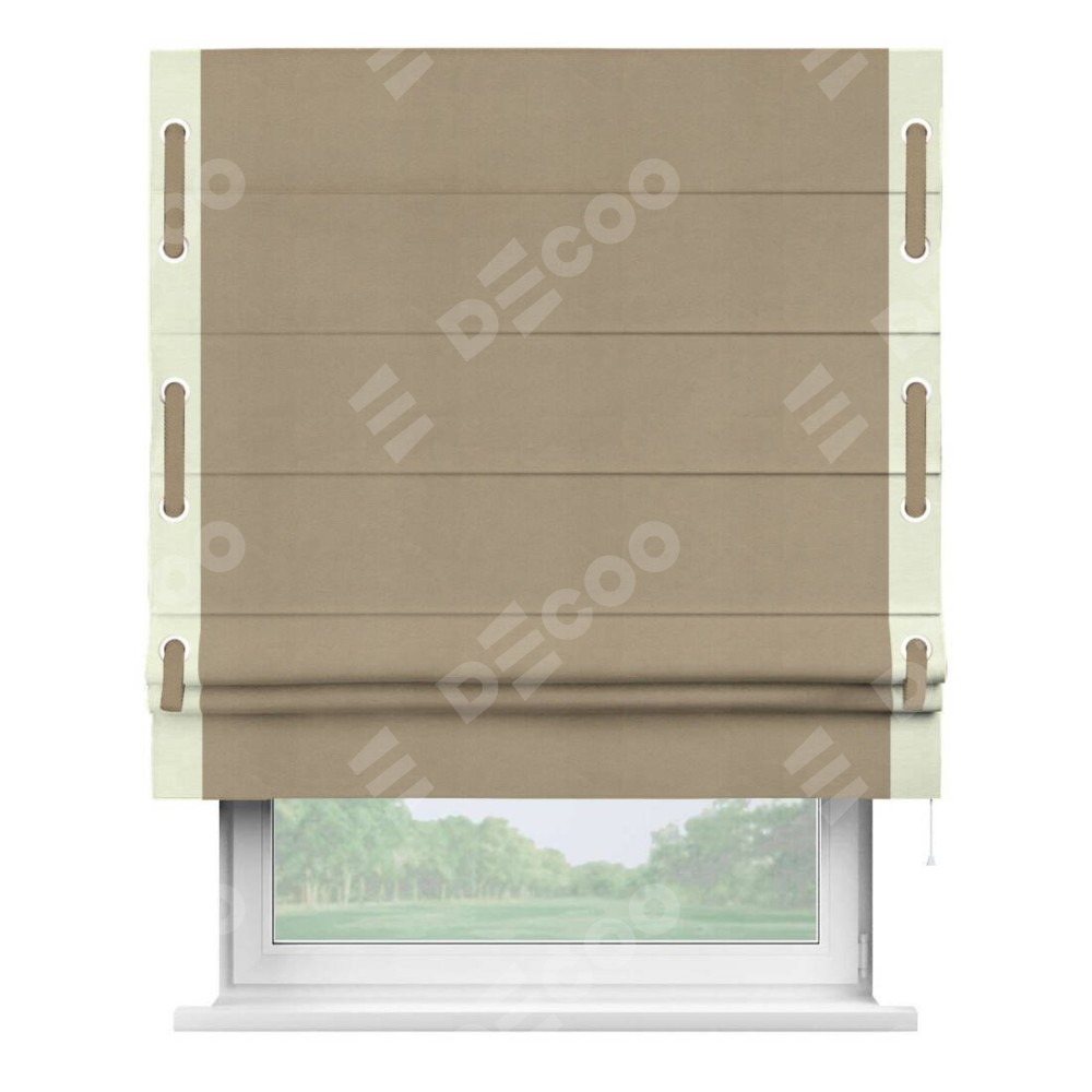 Римская штора производителя «Cortin», используется для проёма, пошита из ткани вельвет кофейный, артикул ткани 30980. Отделка шторы кантом «Стрим Дуо» на кантах расположены люверсы с пояском, ткань для канта используется из вельвета разной расцветки на выбор. Ткань для пояска обычно используется из основной ткани шторы, а так же можно сделать из любой расцветки по желанию. Имеет универсальный механизм и подходит для монтажа: на потолок, на стену и в нишу.