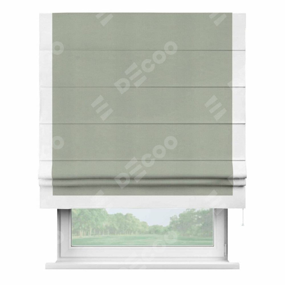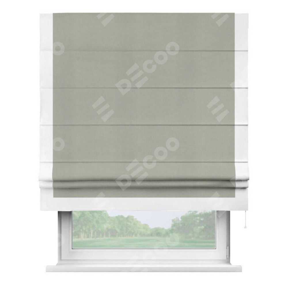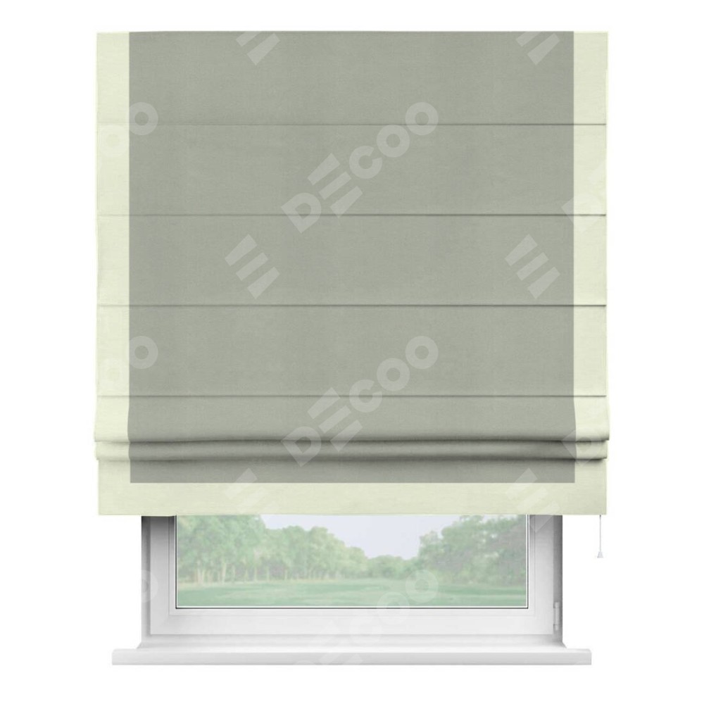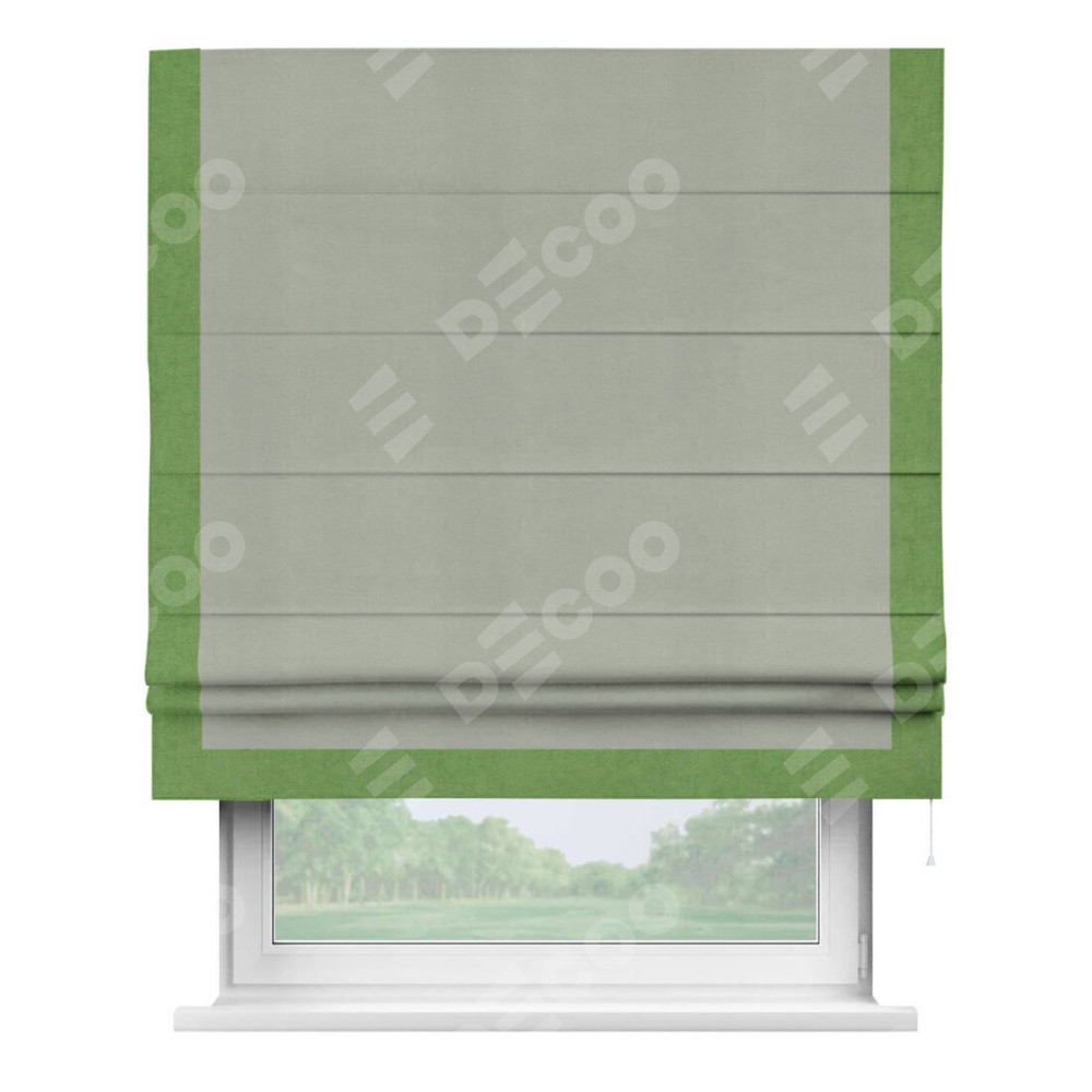 Римская штора производителя «Cortin», используется для проёма, пошита из ткани вельвет cветло-серый, артикул ткани 30981. Отделка шторы кантом «Виктория», ткань для канта используется из вельвета разной расцветки на выбор. Имеет универсальный механизм и подходит для монтажа: на потолок, на стену и в нишу.