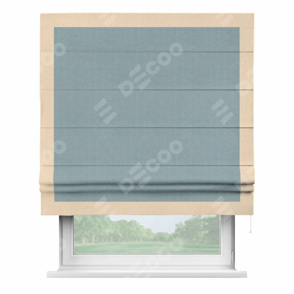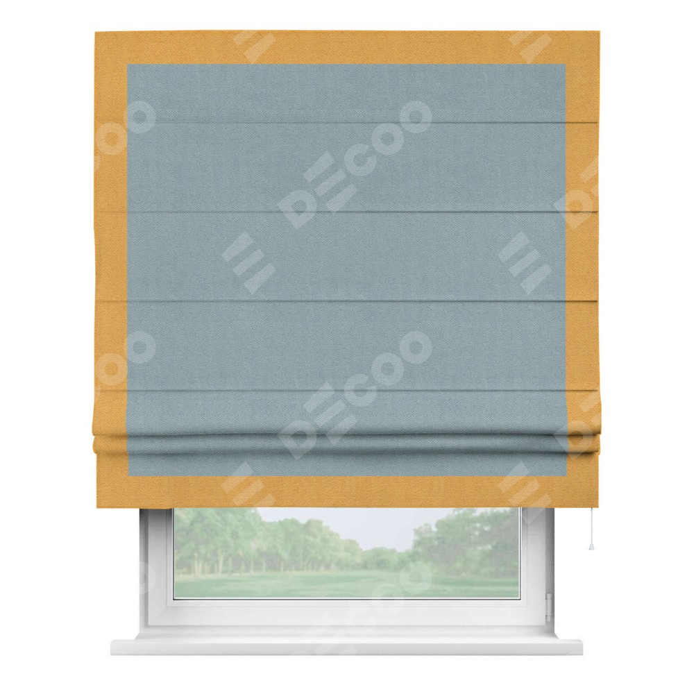 Римская штора производителя «Cortin», используется для проёма, пошита из ткани блэкаут с блеском синий, артикул 34625. Отделка шторы кантом «Чесс», ткань для канта используется из блэкаута с блеском разной расцветки на выбор. Изнаночная сторона материала черного цвета, что обеспечивает необходимую светонепроницаемость. Имеет универсальный механизм и подходит для монтажа: на потолок, на стену и в нишу.