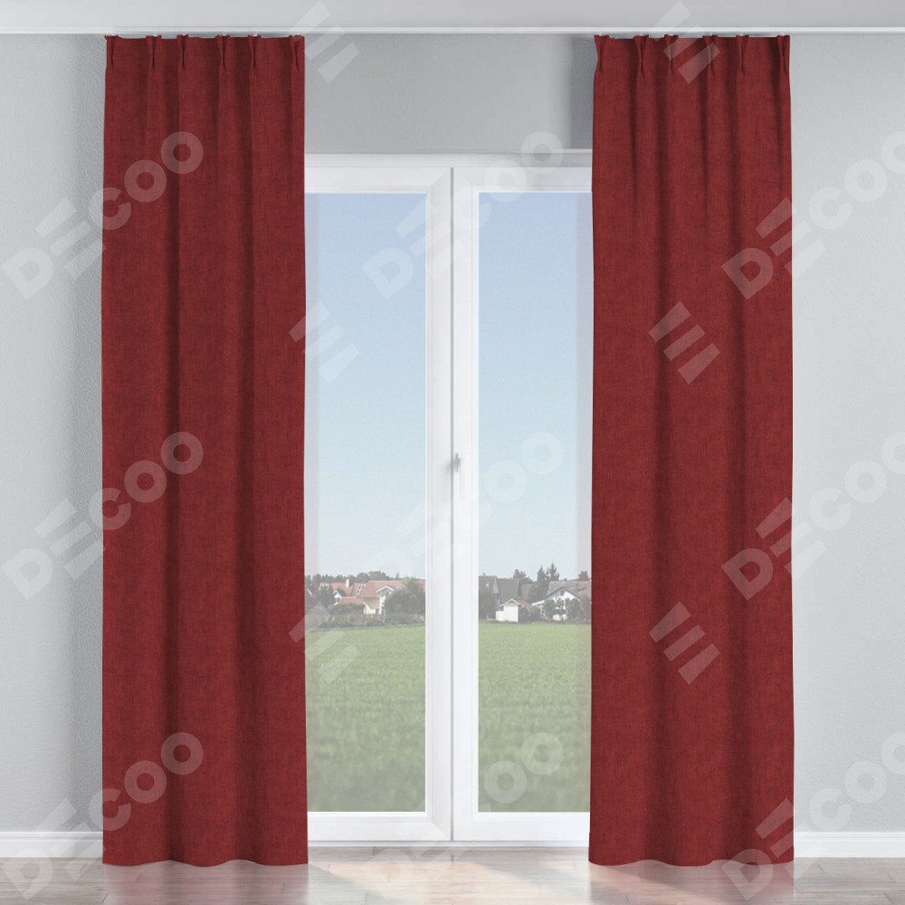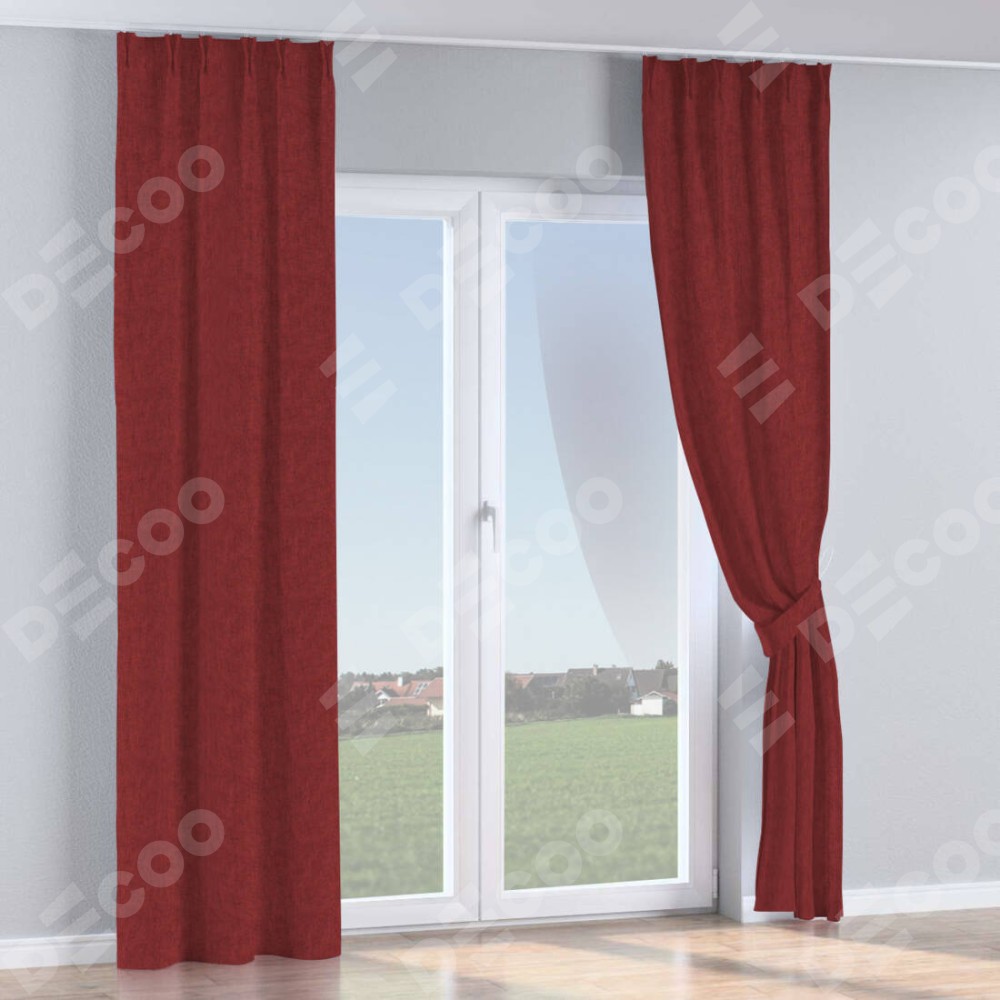 Комплект прямых штор, от производителя «Cortin», пошиты из ткани лён кашемир бордовый, артикул ткани 17213. С изнаночной стороны в верхней части штор пристрачивается шторная лента с декоративными складками «Кустик». Для создания элегантных складок прямые шторы шьются по стандарту с коэффициентом 1:2 (на 100 см. ширины проёма 200 см. ширины ткани).