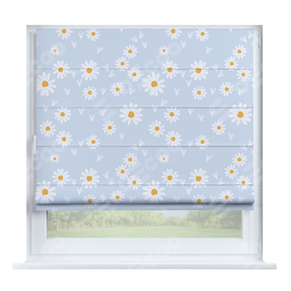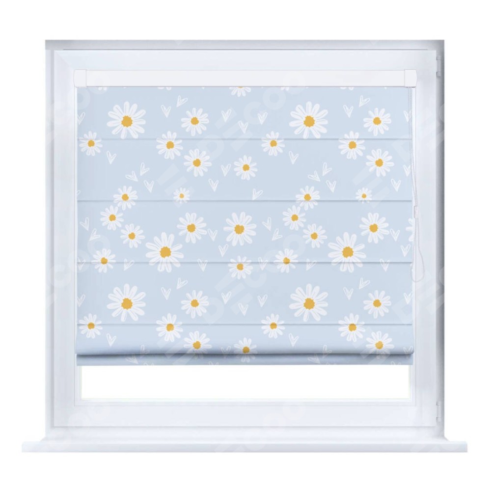 Римская штора производителя «Cortin», устанавливается на створку окна, пошита из ткани блэкаут с нанесением сублимационной печати «Летние ромашки». Штора шьётся по индивидуальным размерам, для данного типа римской шторы возможная ширина от 35 до 150 см., высота до 250 см.