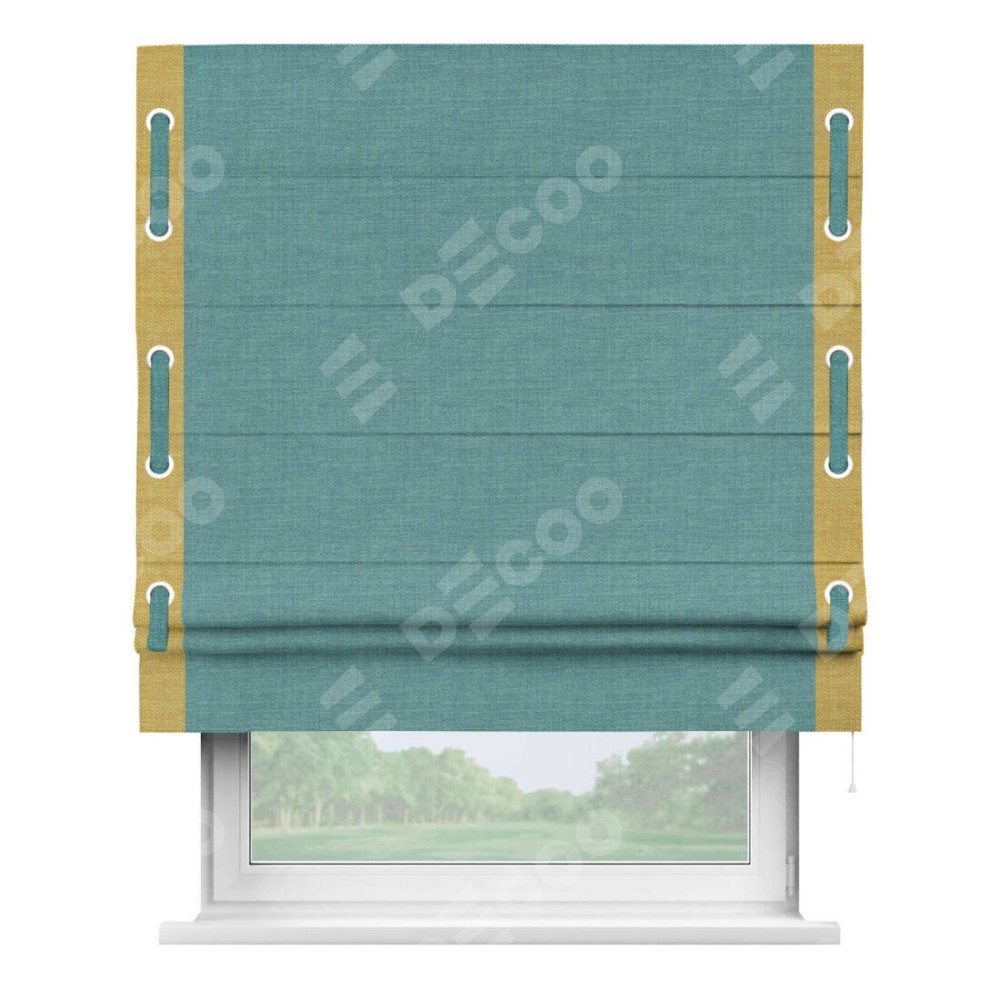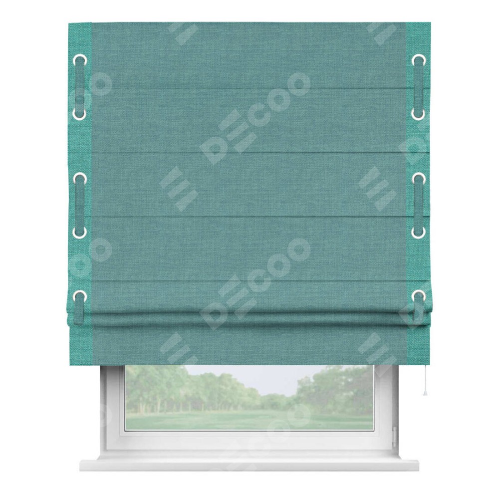 Римская штора производителя «Cortin», используется для проёма, пошита из ткани лён бирюза, артикул 7446. Отделка шторы кантом «Стрим Дуо» на кантах расположены люверсы с пояском, ткань для канта используется из льна разной расцветки на выбор. Ткань для пояска обычно используется из основной ткани шторы, а так же можно сделать из любой расцветки по желанию. Имеет универсальный механизм и подходит для монтажа: на потолок, на стену и в нишу.