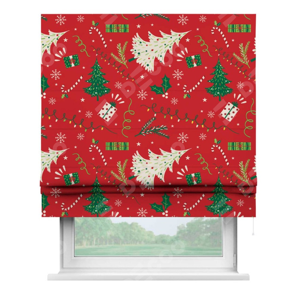 Римская штора производителя «Cortin», используется для проёма, пошита из ткани блэкаут с нанесением сублимационной печати «Новогодние подарки». Имеет универсальный механизм и подходит для монтажа: на потолок, на стену и в нишу.