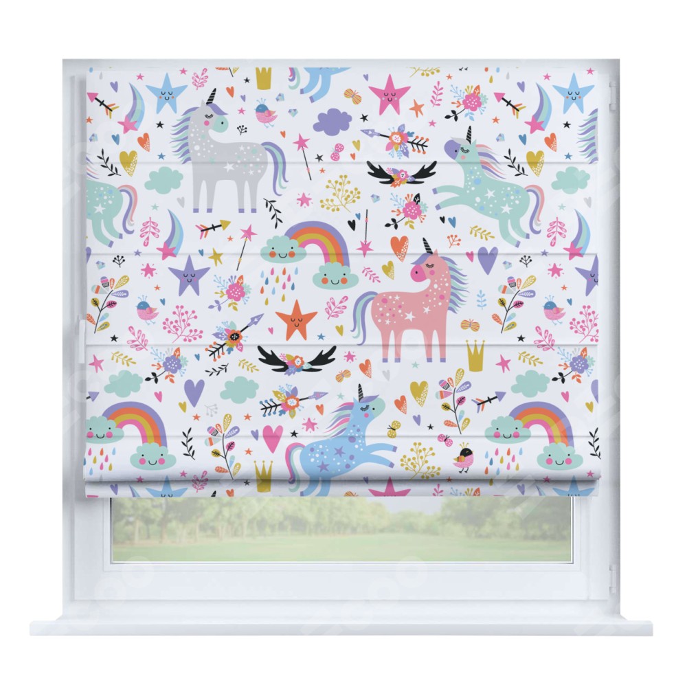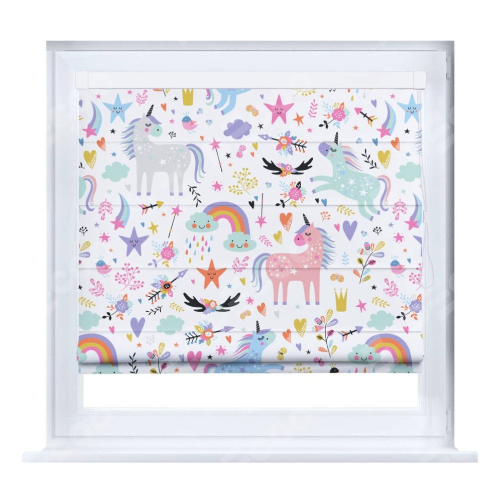 Римская штора производителя «Cortin», устанавливается на створку окна, пошита из ткани блэкаут с нанесением сублимационной печати «Радужные единороги». Штора шьётся по индивидуальным размерам, для данного типа римской шторы возможная ширина от 35 до 150 см., высота до 250 см.