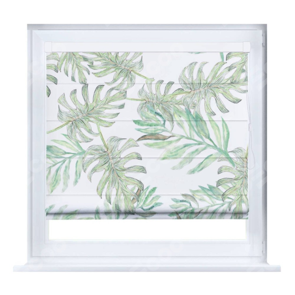 Римская штора производителя «Cortin», устанавливается на створку окна, пошита из ткани блэкаут с нанесением сублимационной печати «Листья монстеры». Штора шьётся по индивидуальным размерам, для данного типа римской шторы возможная ширина от 35 до 150 см., высота до 250 см.