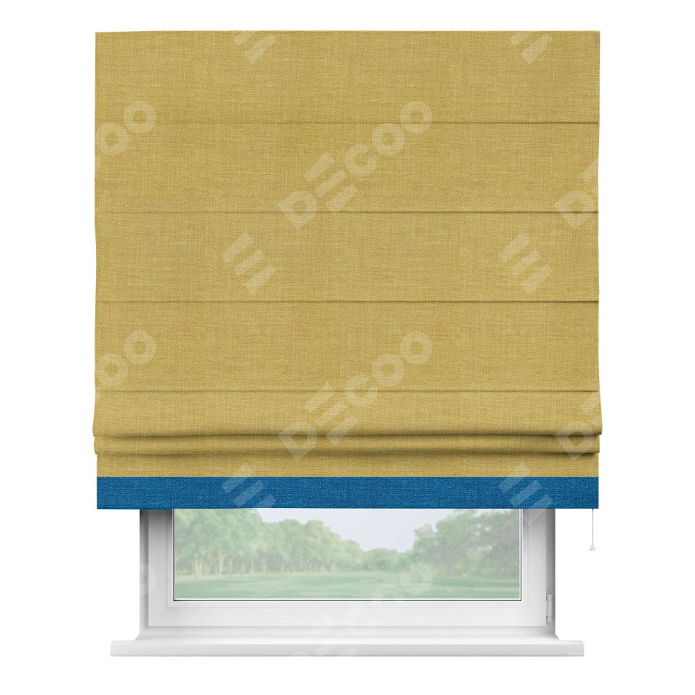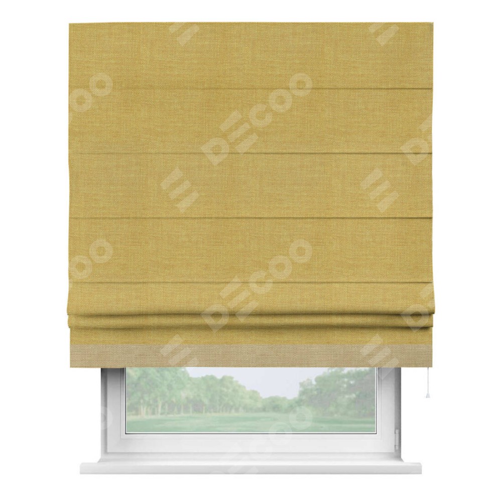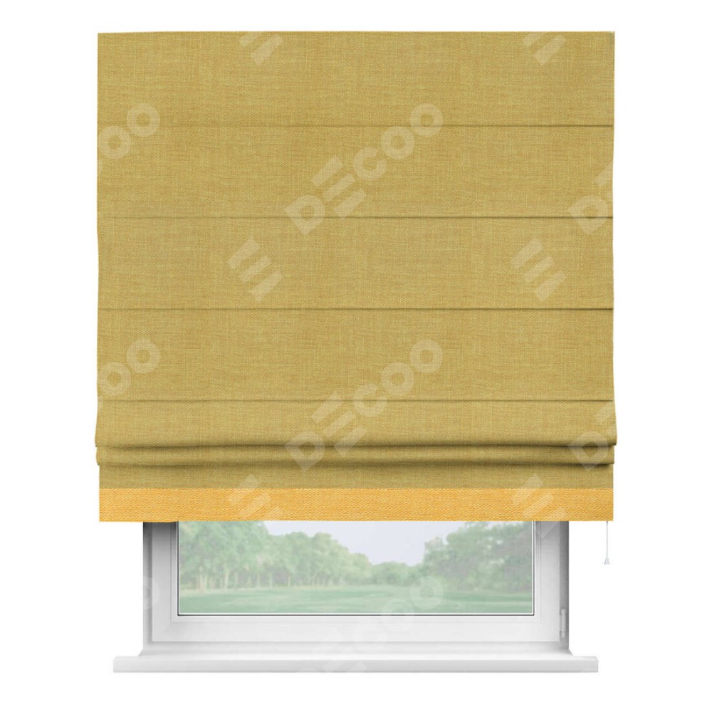 Римская штора производителя «Cortin», используется для проёма, пошита из ткани лён горчичный, артикул 74740. Отделка шторы кантом «Джестер», ткань для канта используется из льна разной расцветки на выбор. Имеет универсальный механизм и подходит для монтажа: на потолок, на стену и в нишу.