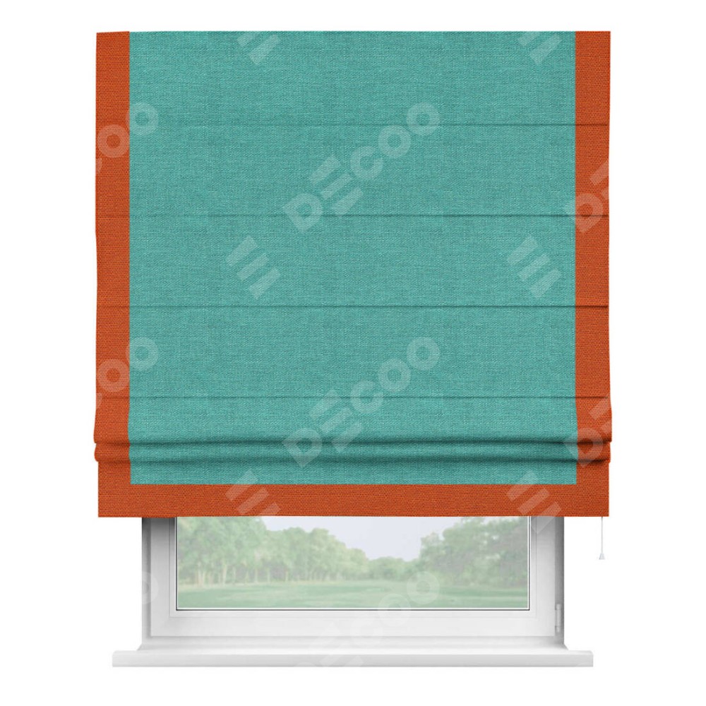 Римская штора производителя «Cortin», используется для проёма, пошита из ткани лён изумрудный, артикул 85908. Отделка шторы кантом «Виктория», ткань для канта используется из льна разной расцветки на выбор. Имеет универсальный механизм и подходит для монтажа: на потолок, на стену и в нишу.