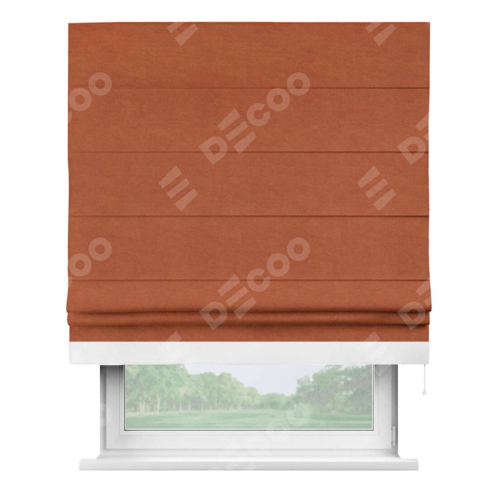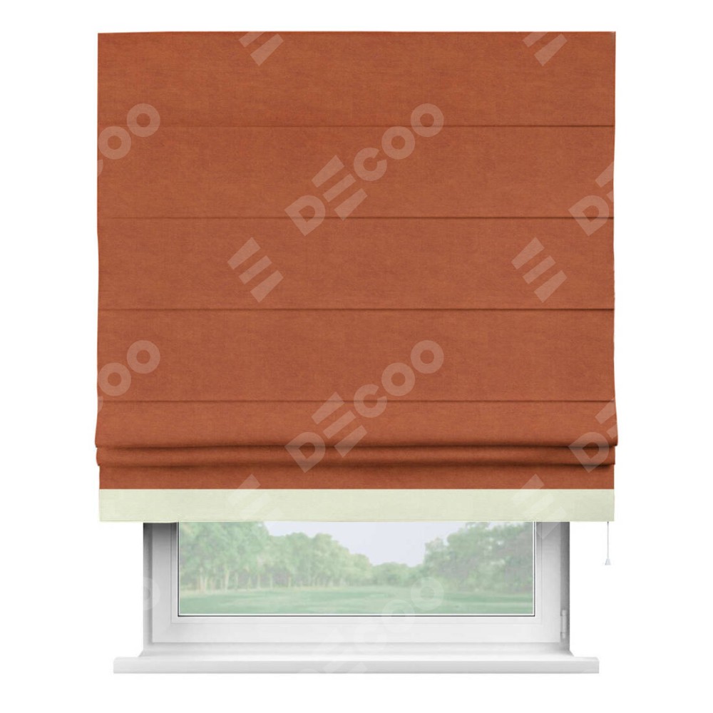 Римская штора производителя «Cortin», используется для проёма, пошита из ткани вельвет терракотовый, артикул ткани 85548. Отделка шторы кантом «Джестер», ткань для канта используется из вельвета разной расцветки на выбор. Имеет универсальный механизм и подходит для монтажа: на потолок, на стену и в нишу.