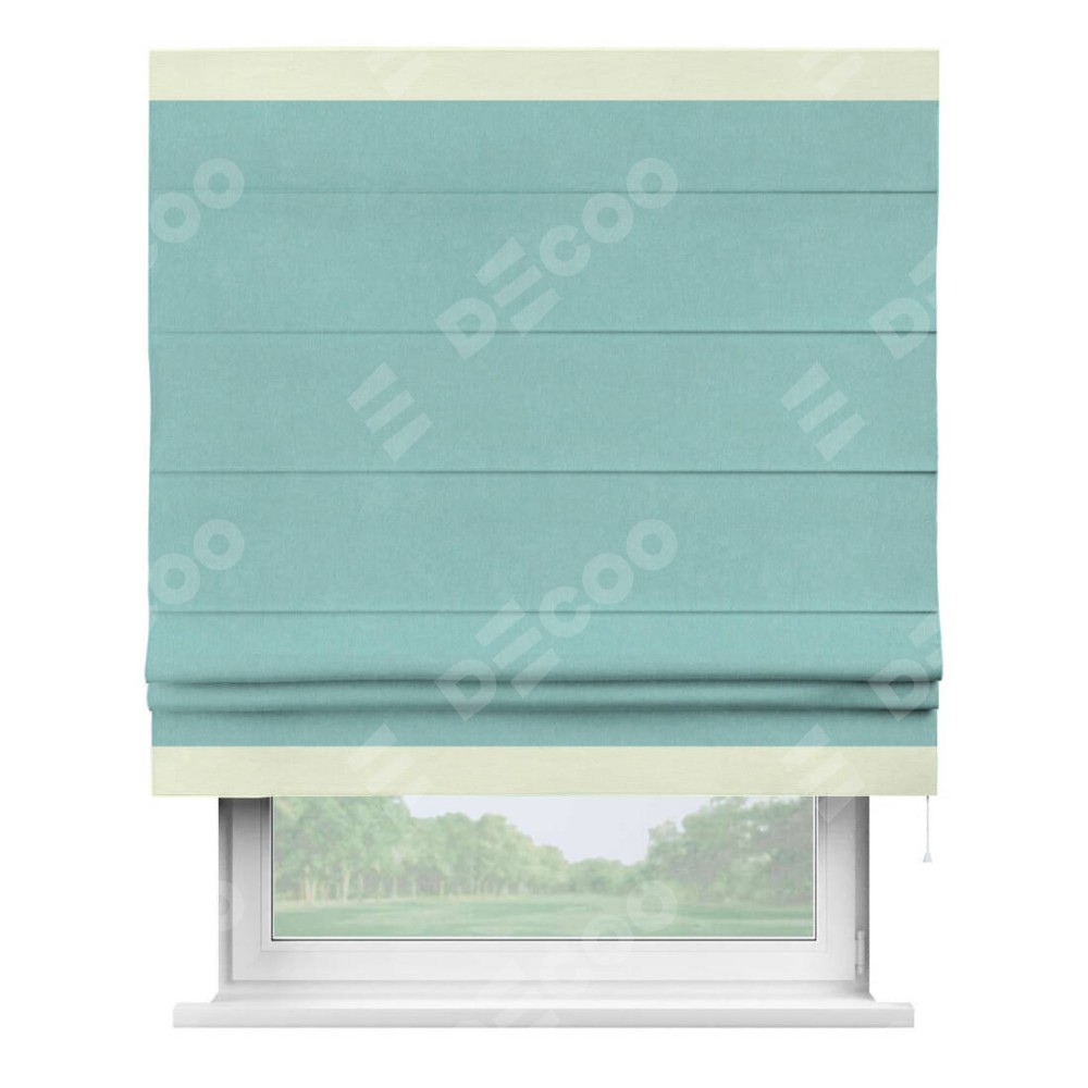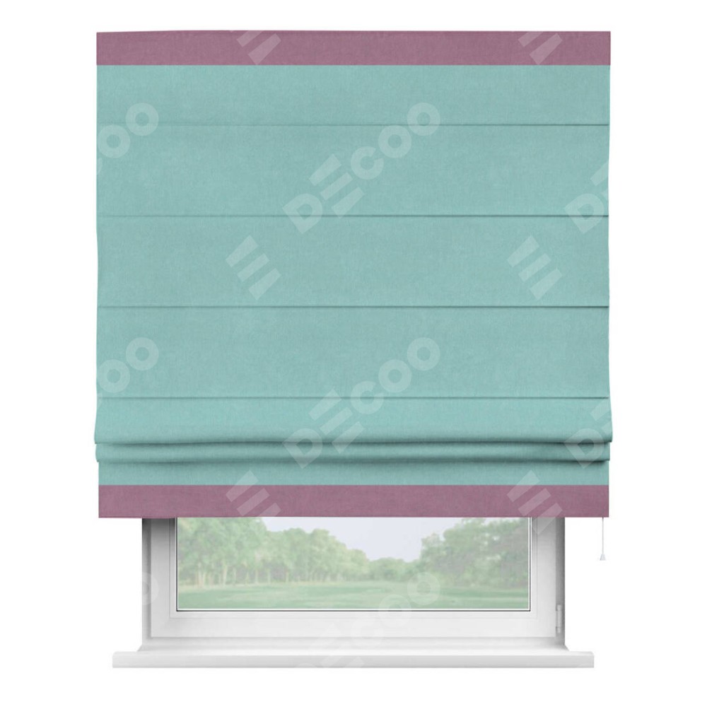 Римская штора производителя «Cortin», используется для проёма, пошита из ткани вельвет тиффани, артикул ткани 17765. Отделка шторы кантом «Горизонт», ткань для канта используется из вельвета разной расцветки на выбор. Имеет универсальный механизм и подходит для монтажа: на потолок, на стену и в нишу.